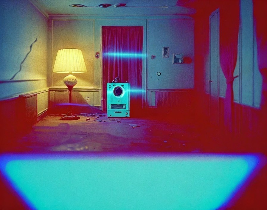 Vintage-themed dimly lit room with lamp, globe, speaker, and ethereal blue light streak