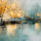 A serene landscape features blurred trees with golden leaves reflecting on calm water. Soft hues create a dreamy atmosphere, evoking tranquility and the beauty of nature's transition.