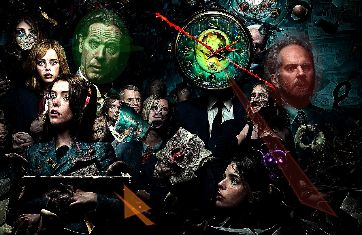 A surreal, dark scene filled with disfigured faces, a distorted clock, and chaotic imagery. Eerie characters emerge from shadows, evoking a sense of dread and confusion in a twisted setting.