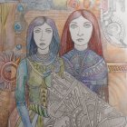 The image features two women with long hair, one with purple tones and the other with reddish hues. They wear colorful, patterned clothing against a vibrant, abstract background of circles and lines.