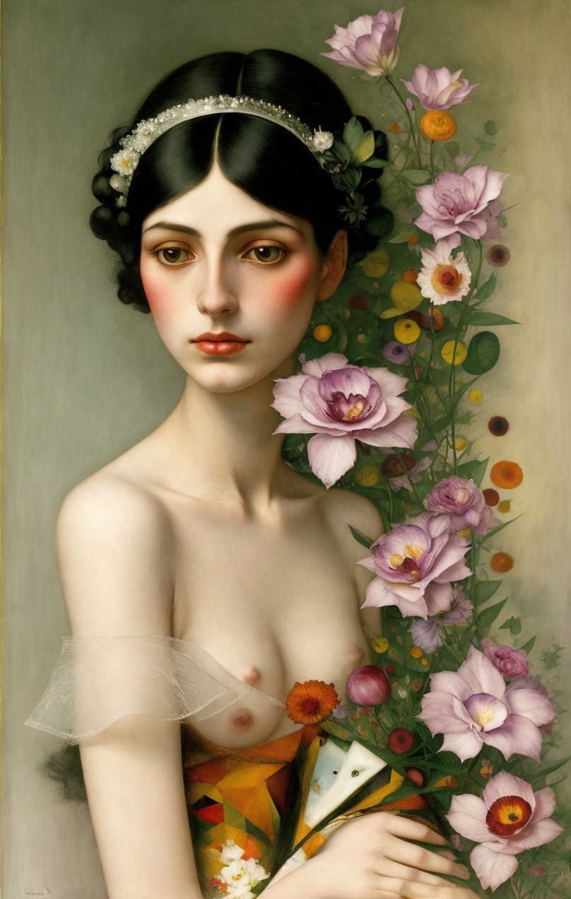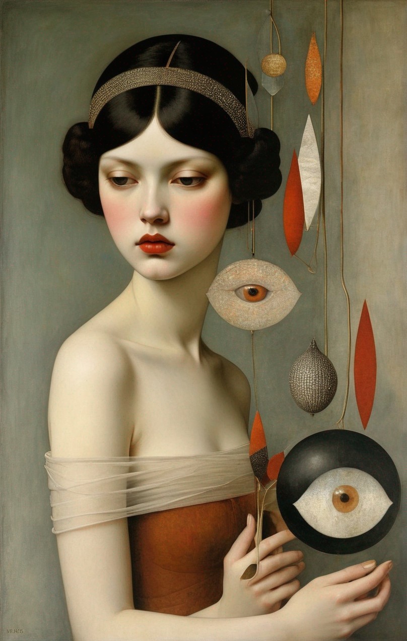 A painting of a pensive young woman with a headband holding a transparent vase, set against a muted background.