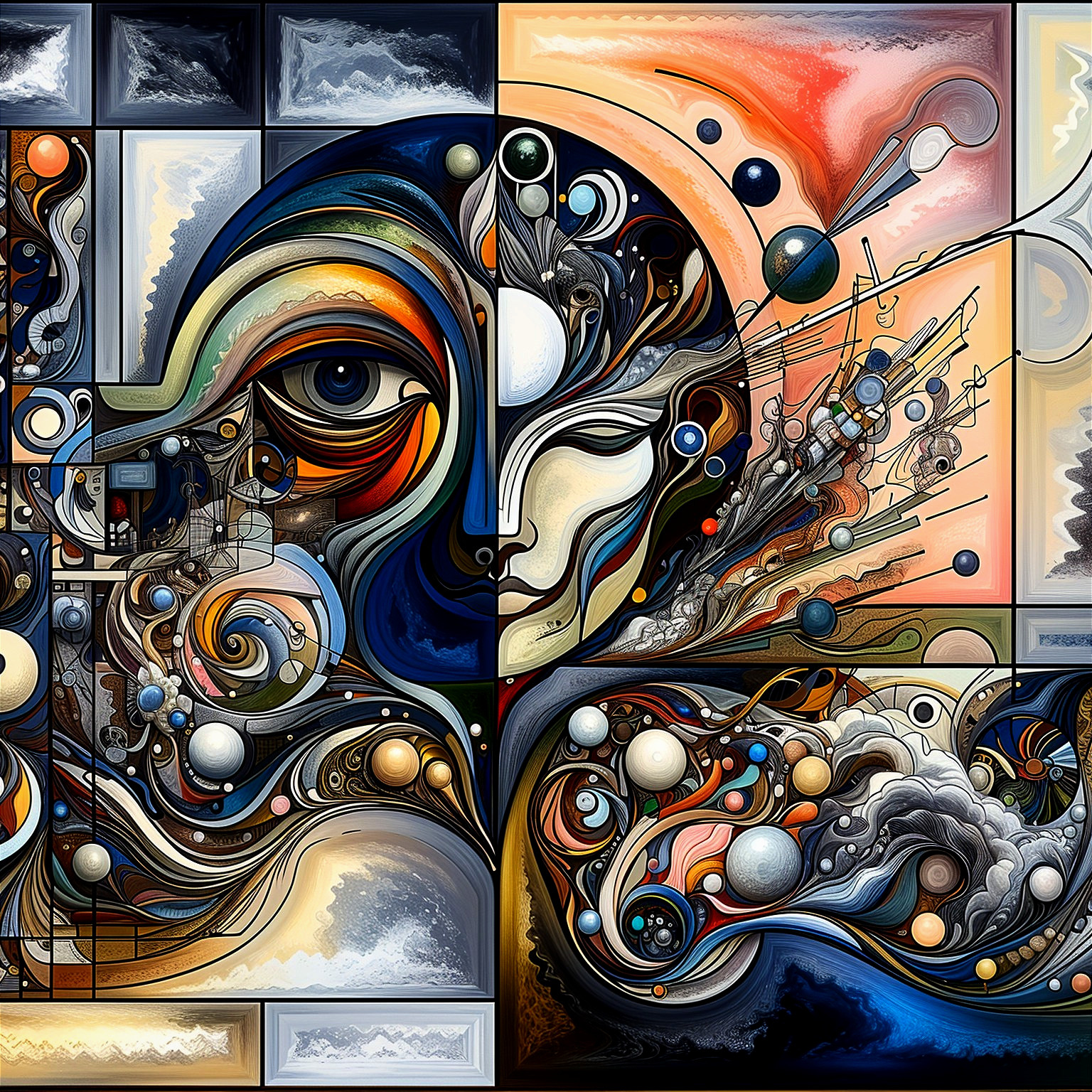 The image features an abstract composition with swirling shapes, vibrant colors, and fragmented forms, blending organic and geometric elements to create a surreal, visually dynamic scene.