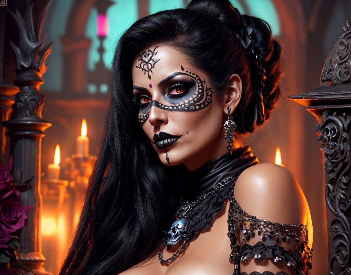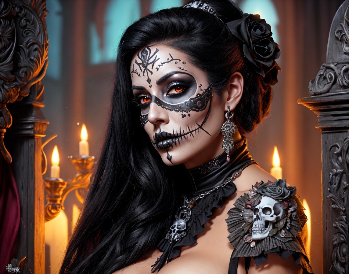 A woman with skull makeup and a gothic outfit poses near candles, evoking a Day of the Dead theme.