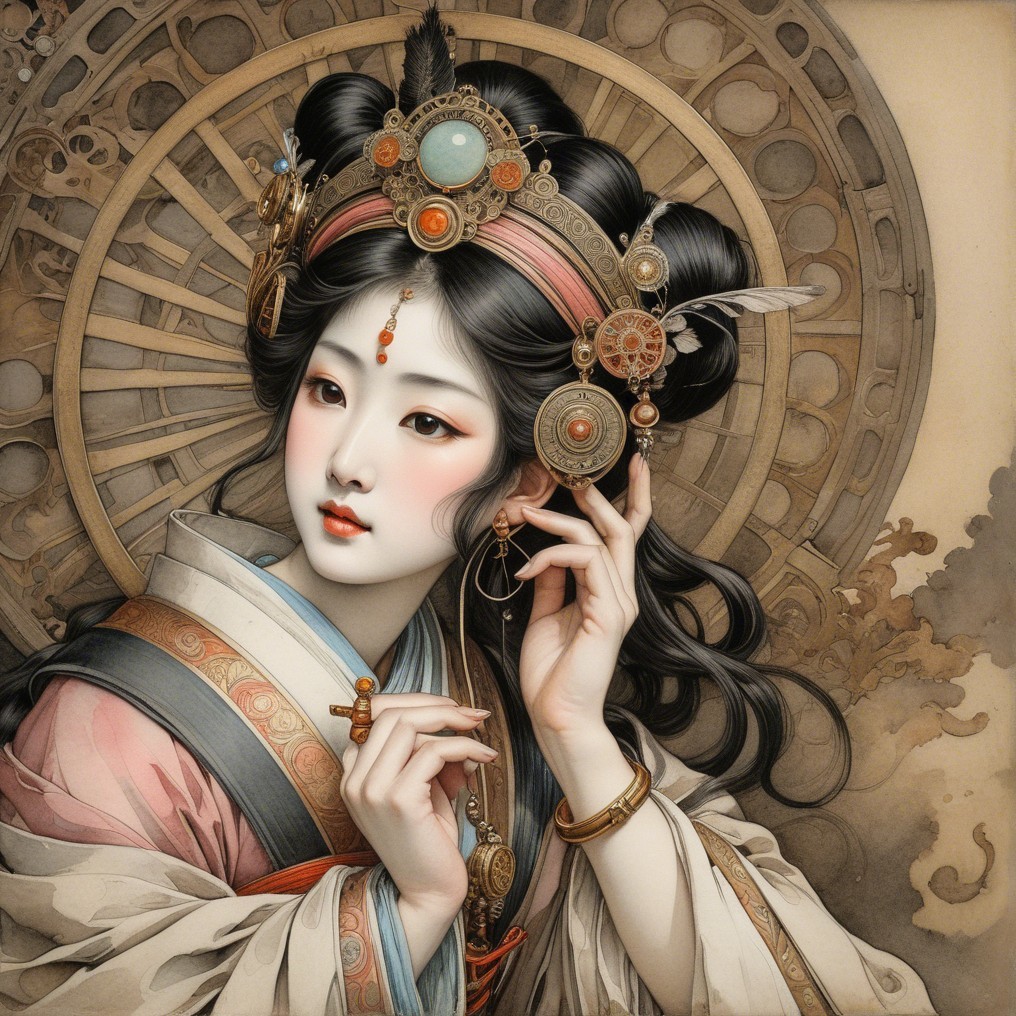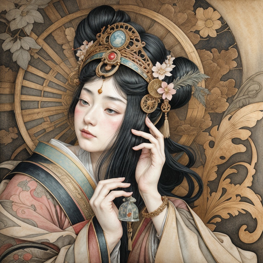 Japanese priestess. , 3rd century Japanese miniature art. colored ink drawing, watercolor artwork on old withered paper, vintage, by Caravaggio, Fragonard, Anton Pieck, pale colors, high detail, intricately detailed, hyperdetailed volumetric lighting, art nouveau graphic steampunk ., whimsical, beautiful, poignant, touching. colors blush bronze, black. soft watercolor extra water in magical realism by Annigoni, Egon Schiele, Milo Manara, Botticelli, Catrin Welz-Stein, Jean Metzinger, Klimt, perfect eyes, perfect handsface, highly detailed, complementary colors, hyper detailed. Watercolor and ink splatter, dynamic pose, dark blue background, unreal engine, alphonse mucha, global illumination, detailed and intricate environment Beautiful woman in the style of Pino Daeni Dorota Piotrowiak Edward Gorey, junji ito, klimnt , gold leaf color, silver leaf color beautiful dynamic lighting high definition hdr * Random prompt award winning Max Ernst ultra detailed 4K 3D Texture