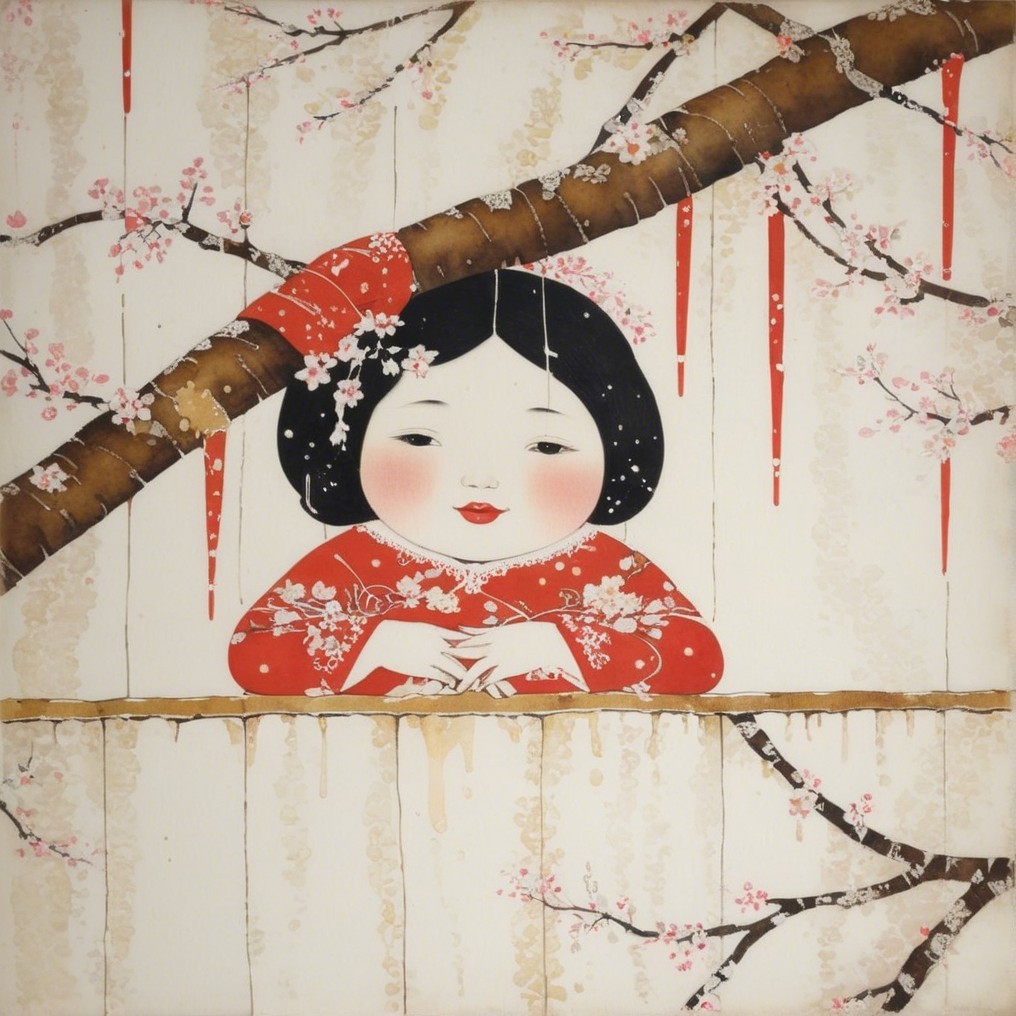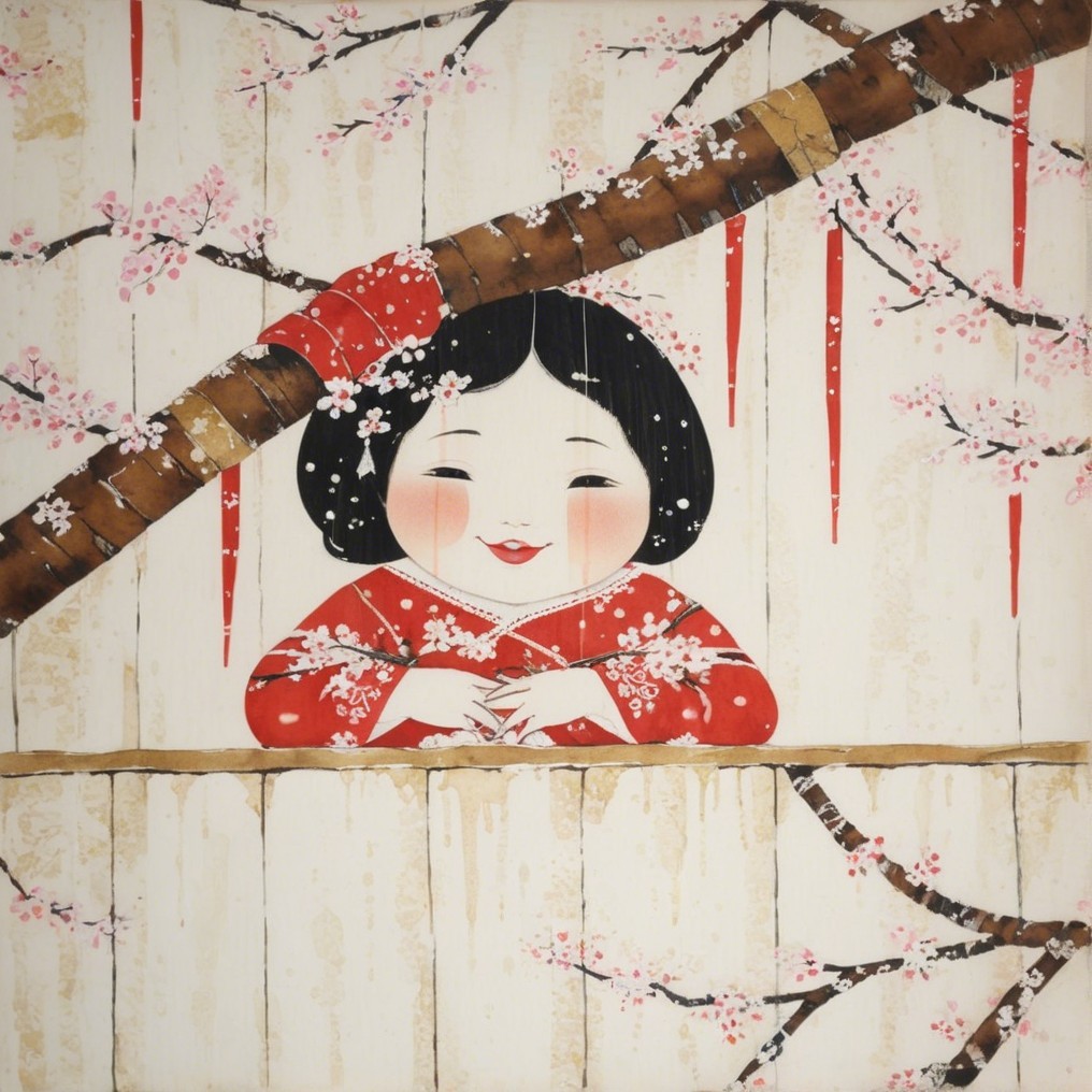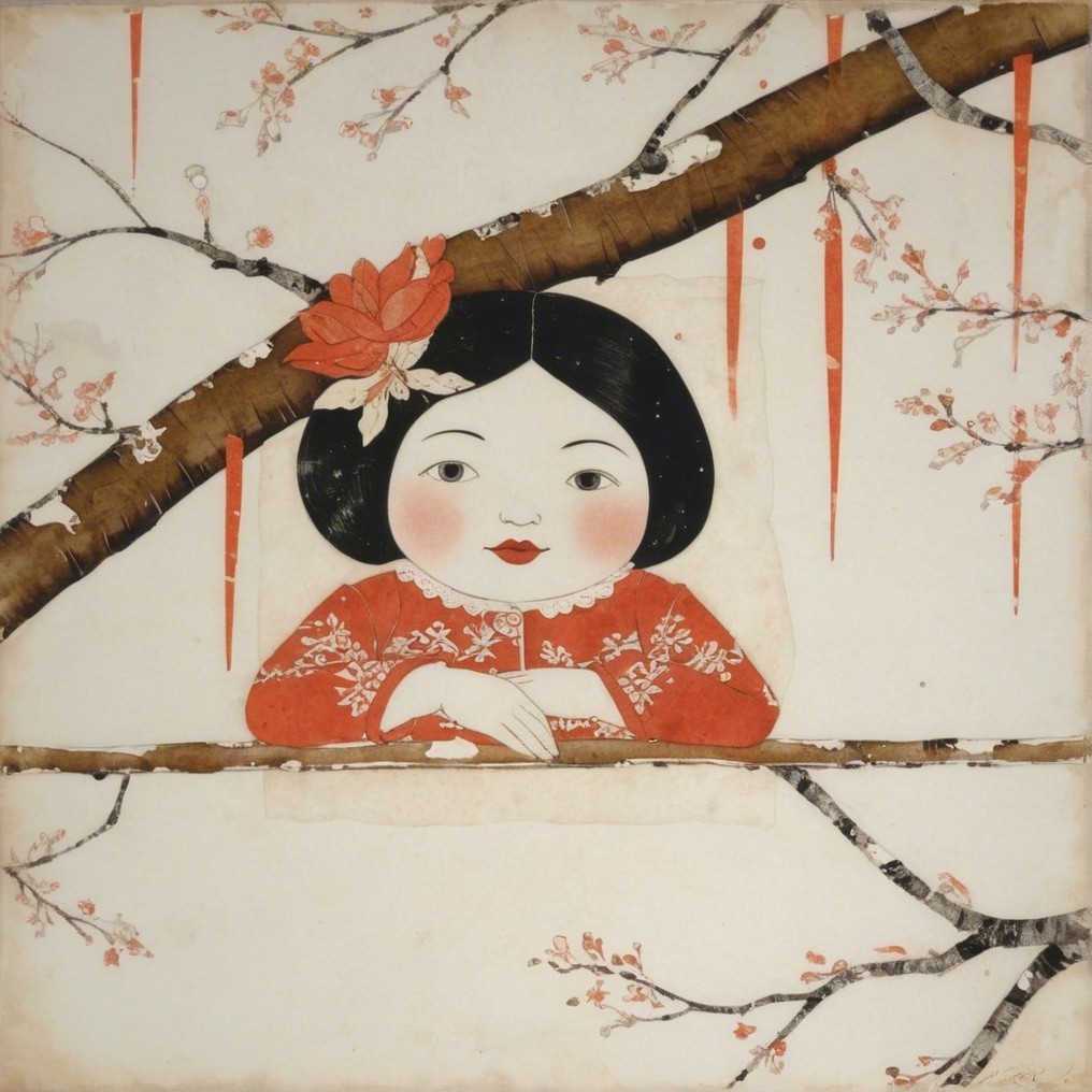 Artistic Statement: This piece blends folk art with modernist refinement, drawing from Japanese woodblock aesthetics and contemporary minimalism. The meticulous linework, restrained color palette, and delicate textile patterns merge nostalgia with quiet surrealism. Enhanced texture and lighting give the composition a more immersive, poetic quality.