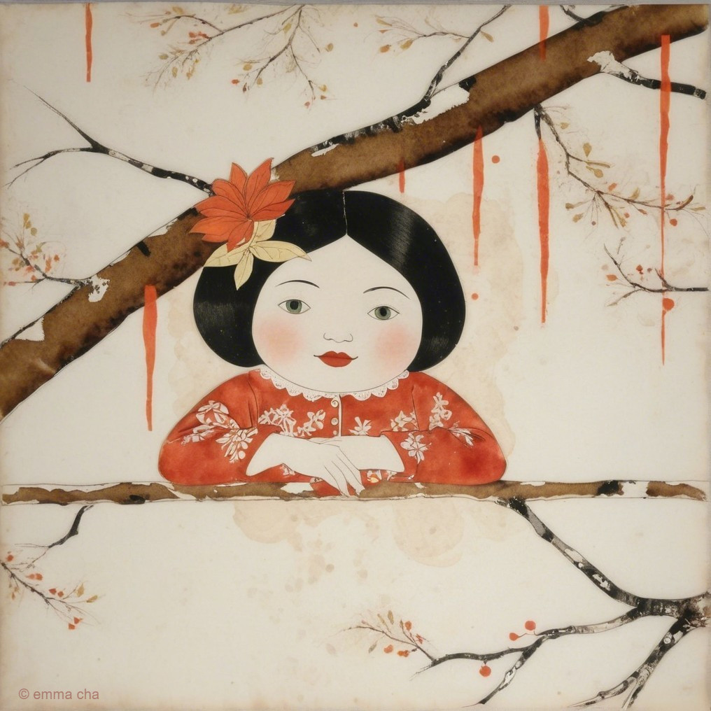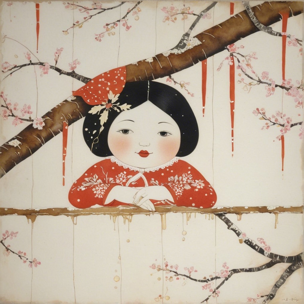 Description: A young girl in a red-patterned kimono leans on a branch, her soft expression gazing into the distance. The composition balances delicate ink-drawn branches with flowing autumn leaves and surreal streaks of crimson. The refined fabric details and enhanced textures add warmth and depth to the ethereal portrait.