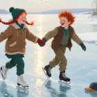 Two joyful children with red hair skate on a frozen lake, holding hands. The scene is bright and playful, capturing the warmth of winter as they glide among patches of ice.