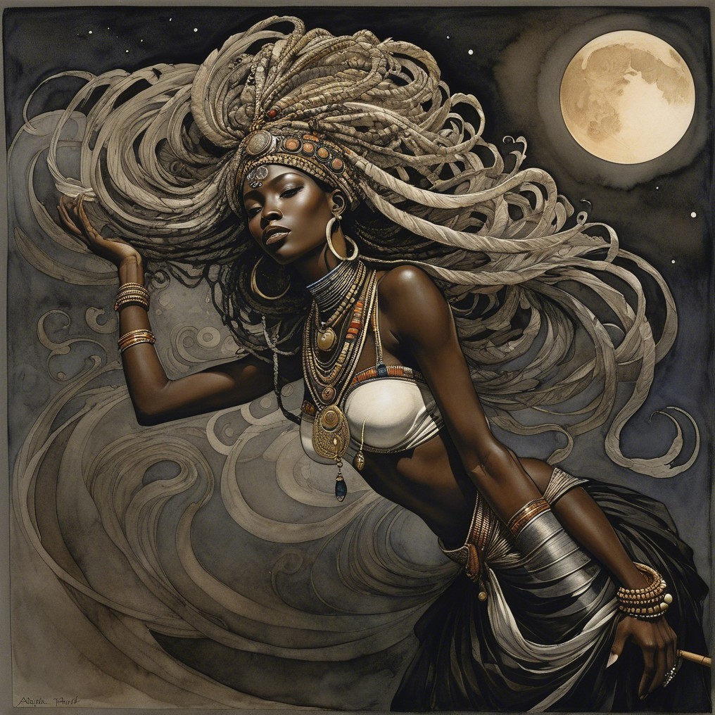 A regal figure with intricate jewelry and flowing hair stands against a night sky, illuminated by a full moon. She wears an elegant, draped garment, exuding confidence and grace.