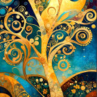 A vibrant, abstract artwork featuring a fox peering through a swirling tree. The rich colors of gold, blue, and orange create a whimsical and enchanting atmosphere. Original Prompt: