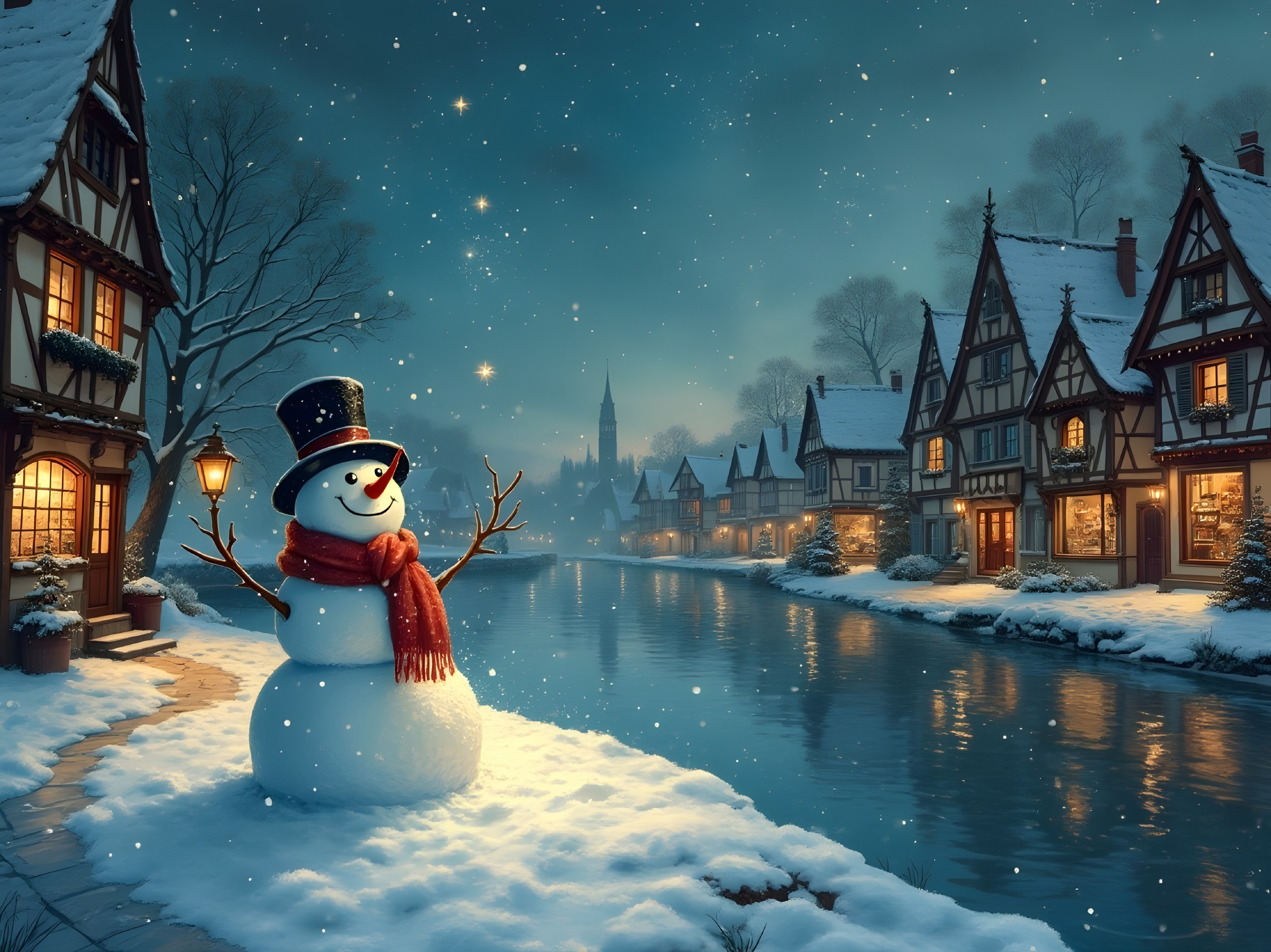 A charming winter scene features a smiling snowman with a top hat and a red scarf by a tranquil river. Quaint houses line the water, illuminated by warm lights and soft snowfall.