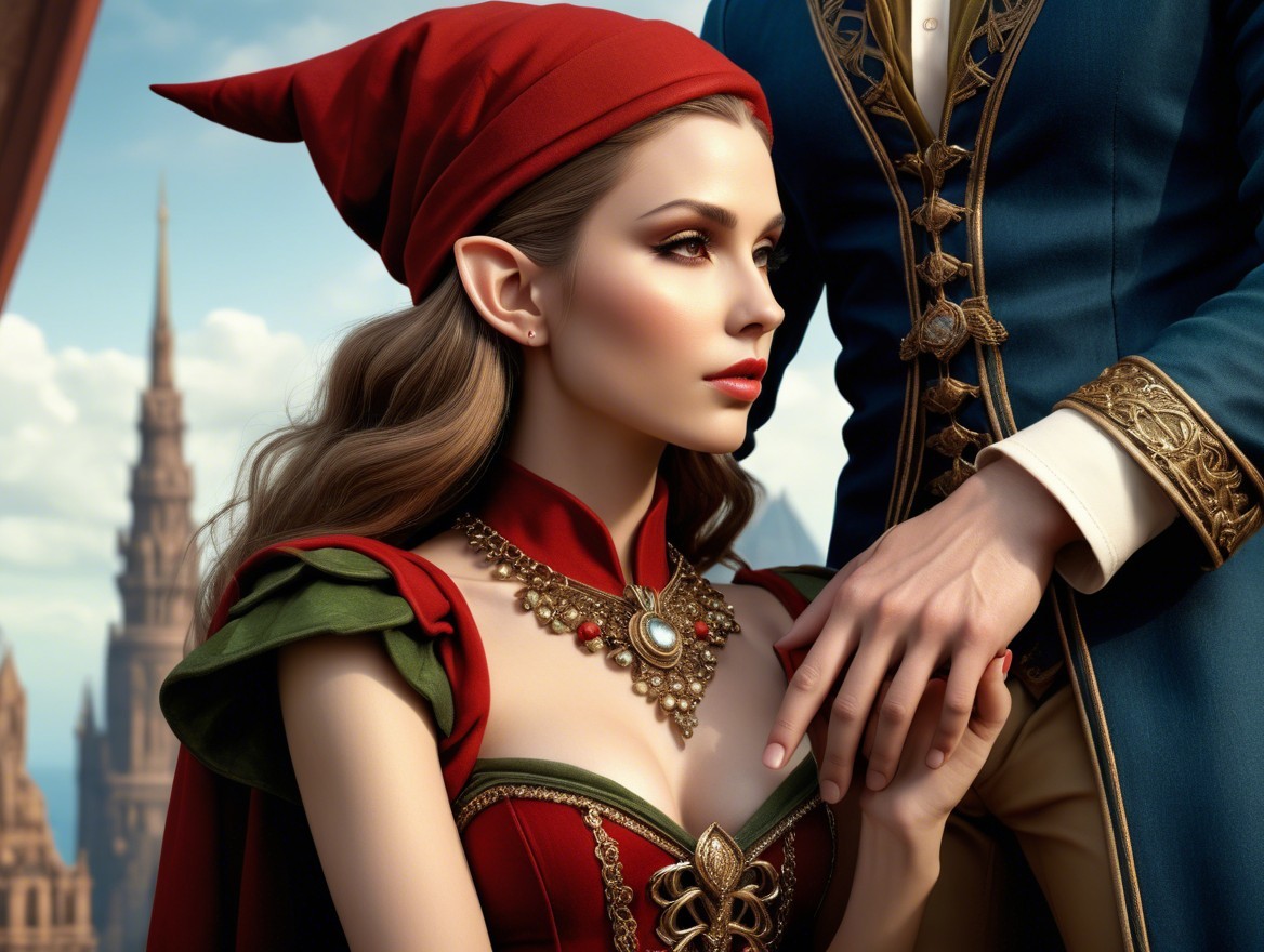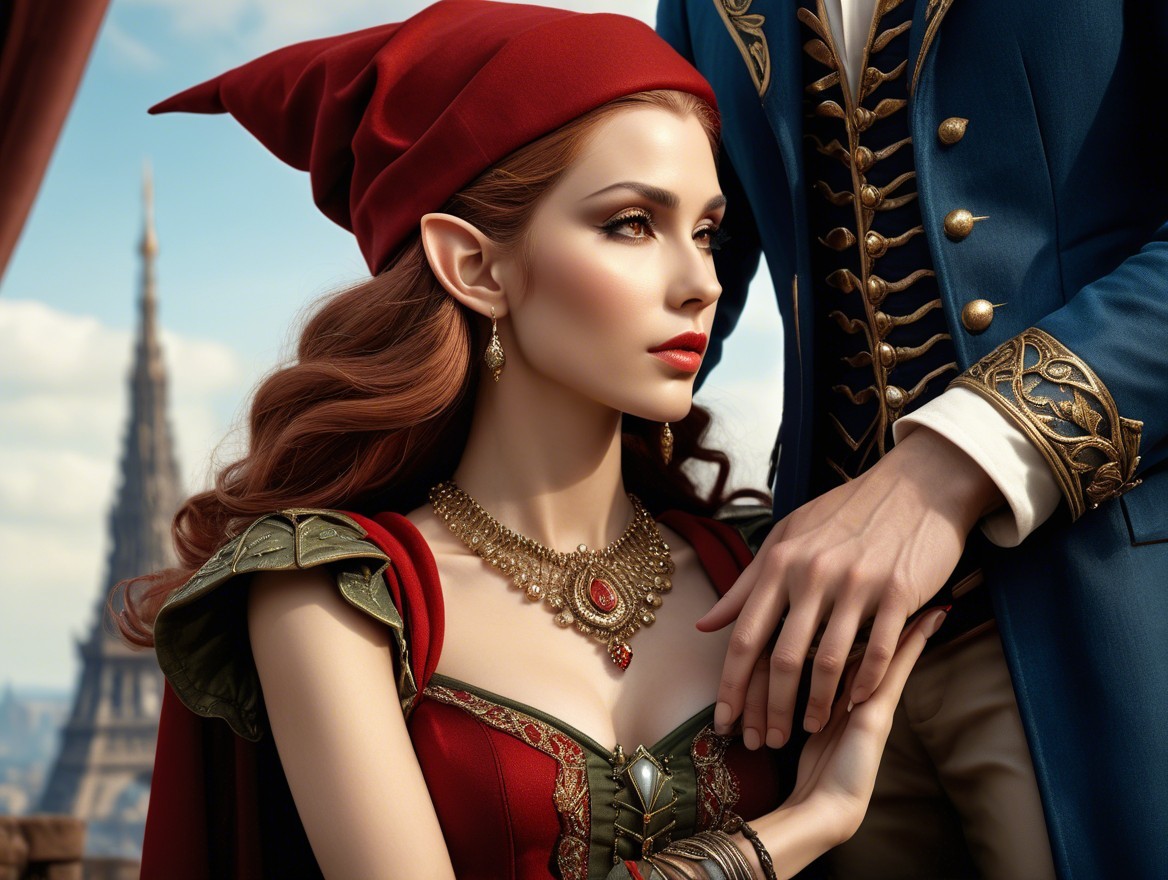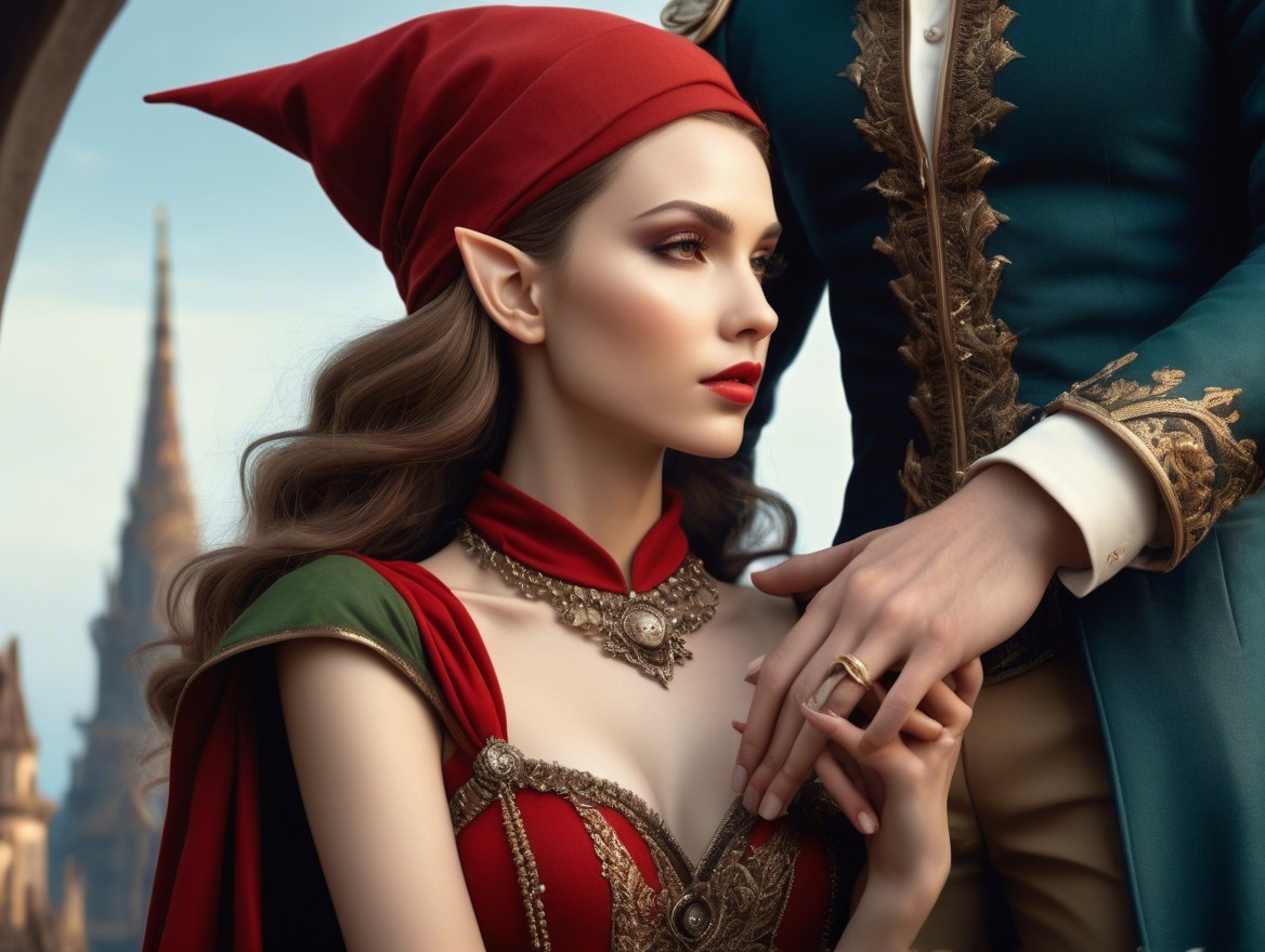 DDG had this to say about its persistent misrepresentation of my artistic ideas: "A woman in a richly designed red gown and pointed hat gazes thoughtfully to the side, her elegant look enhanced by intricate gold details, while a figure beside her gently holds her hands."