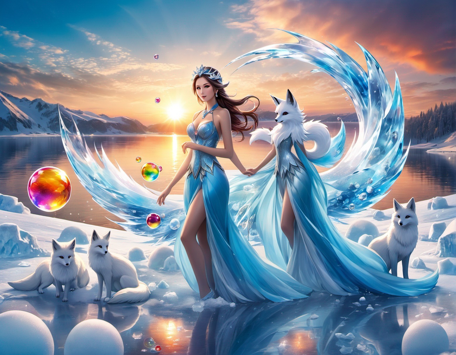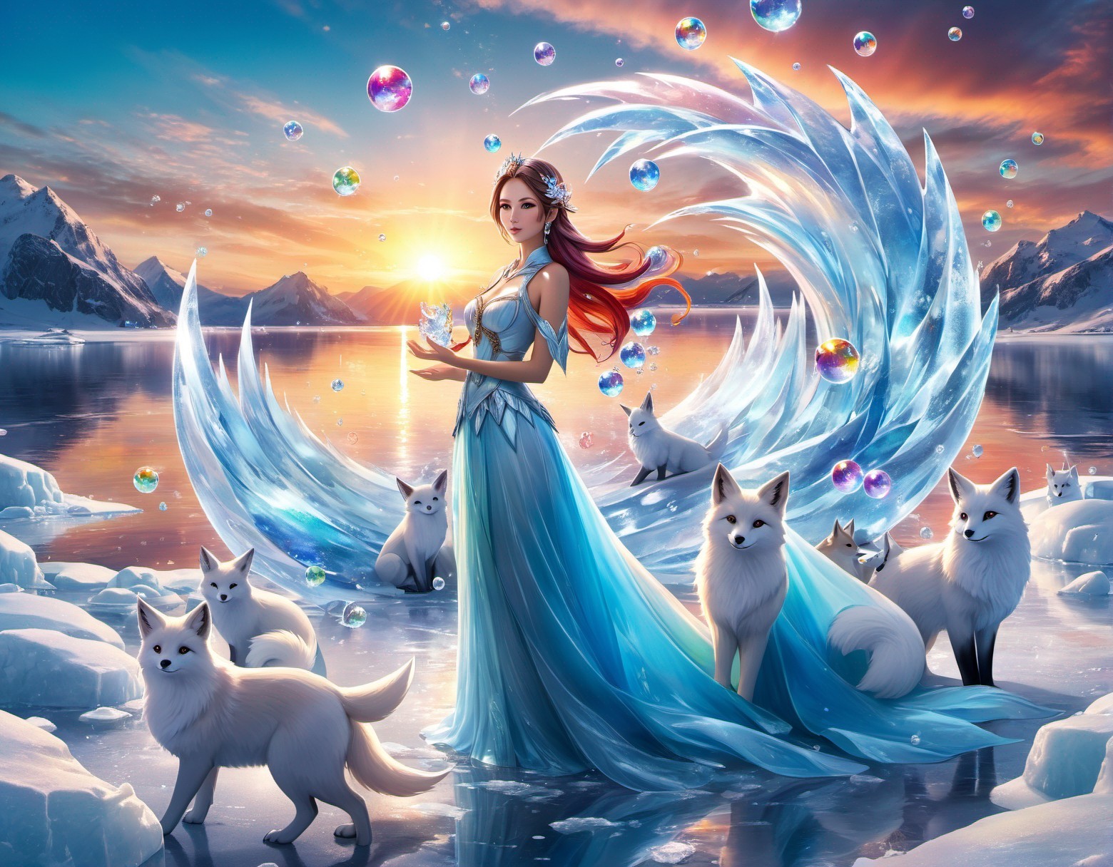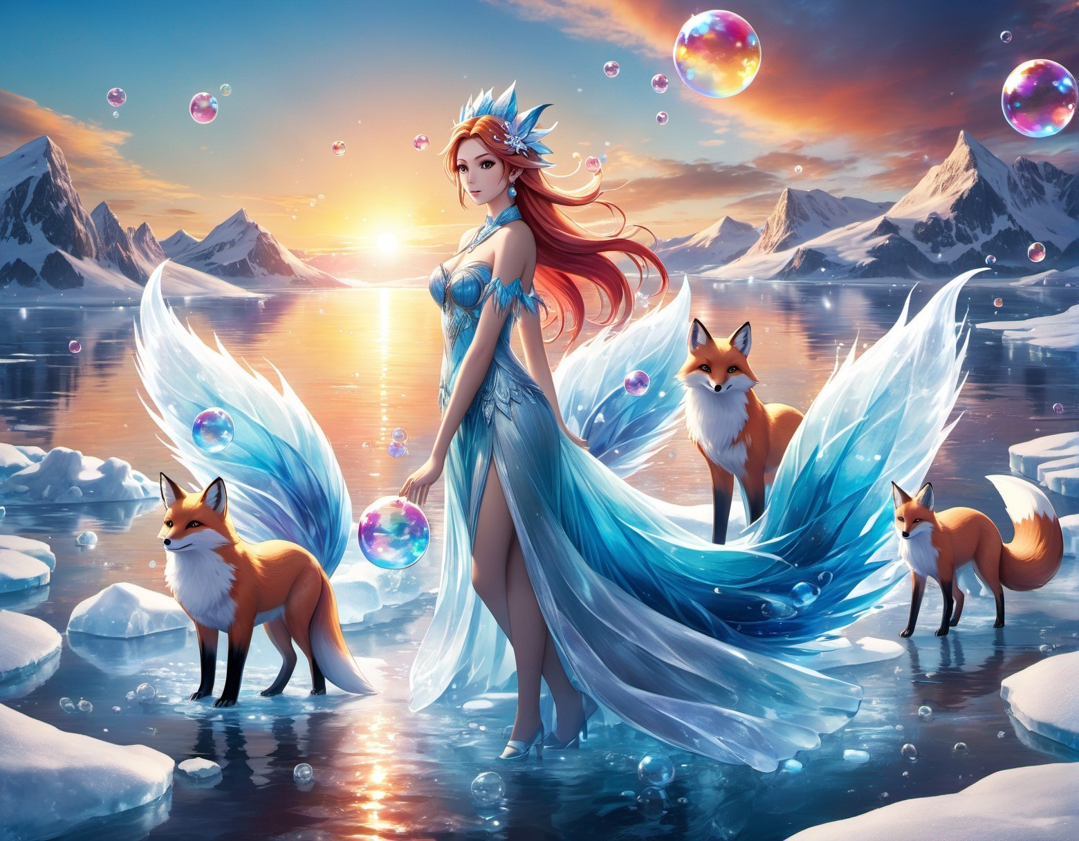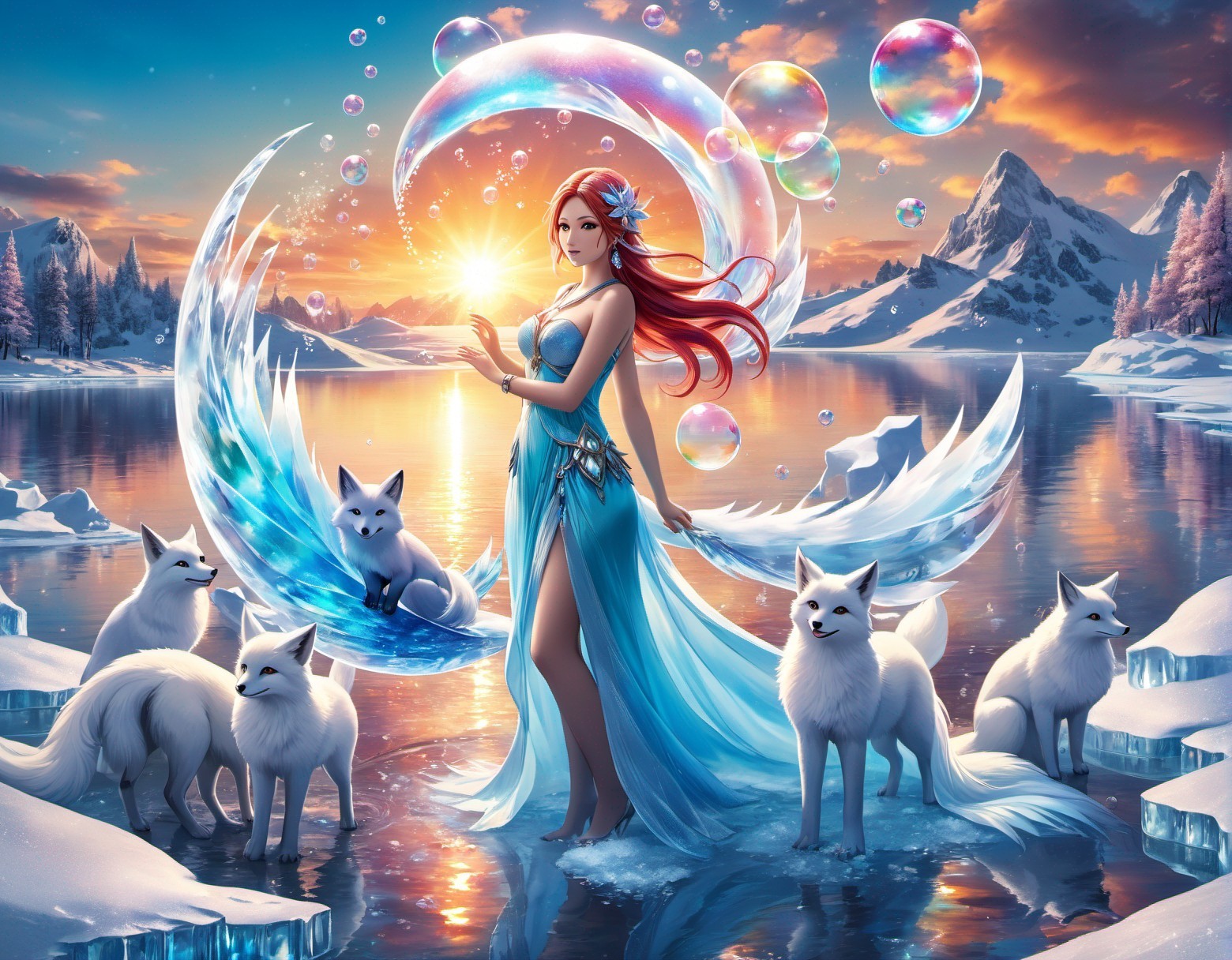 A fantasy illustration of a woman with flowing hair and dress, accompanied by mythical foxes, surrounded by bubbles in a snowy, icy landscape with a vivid sunset.
