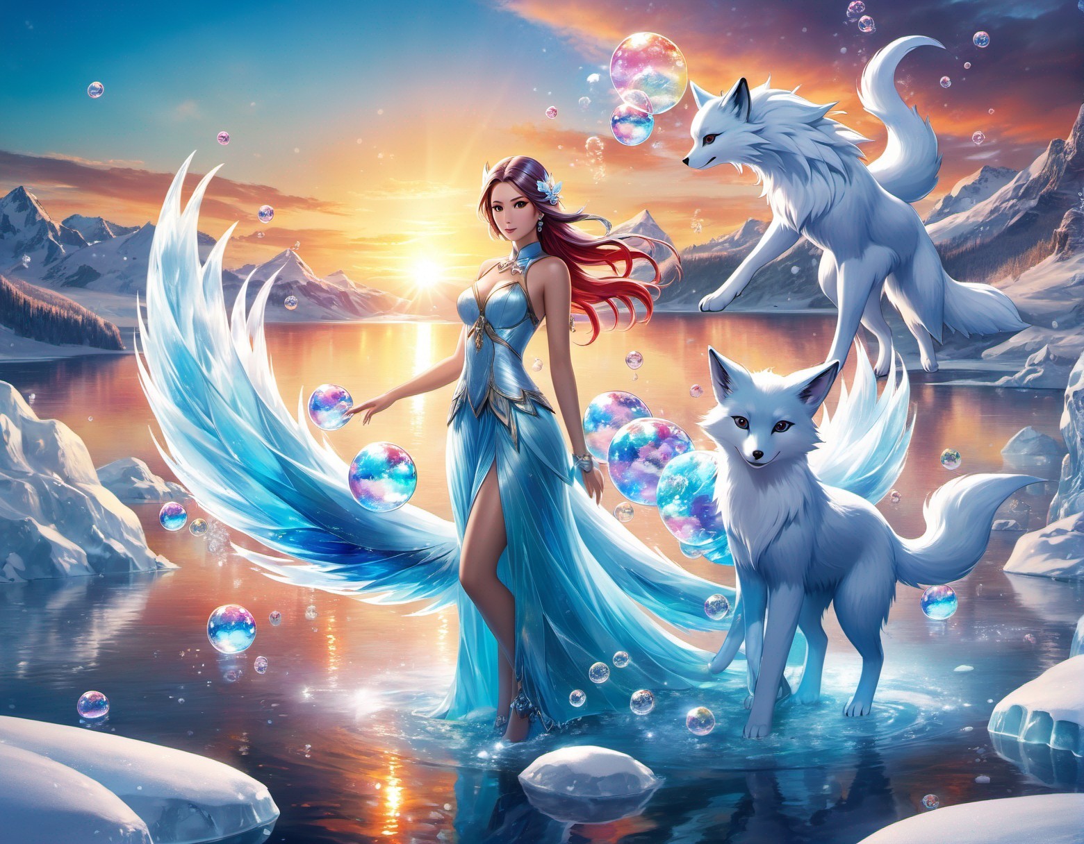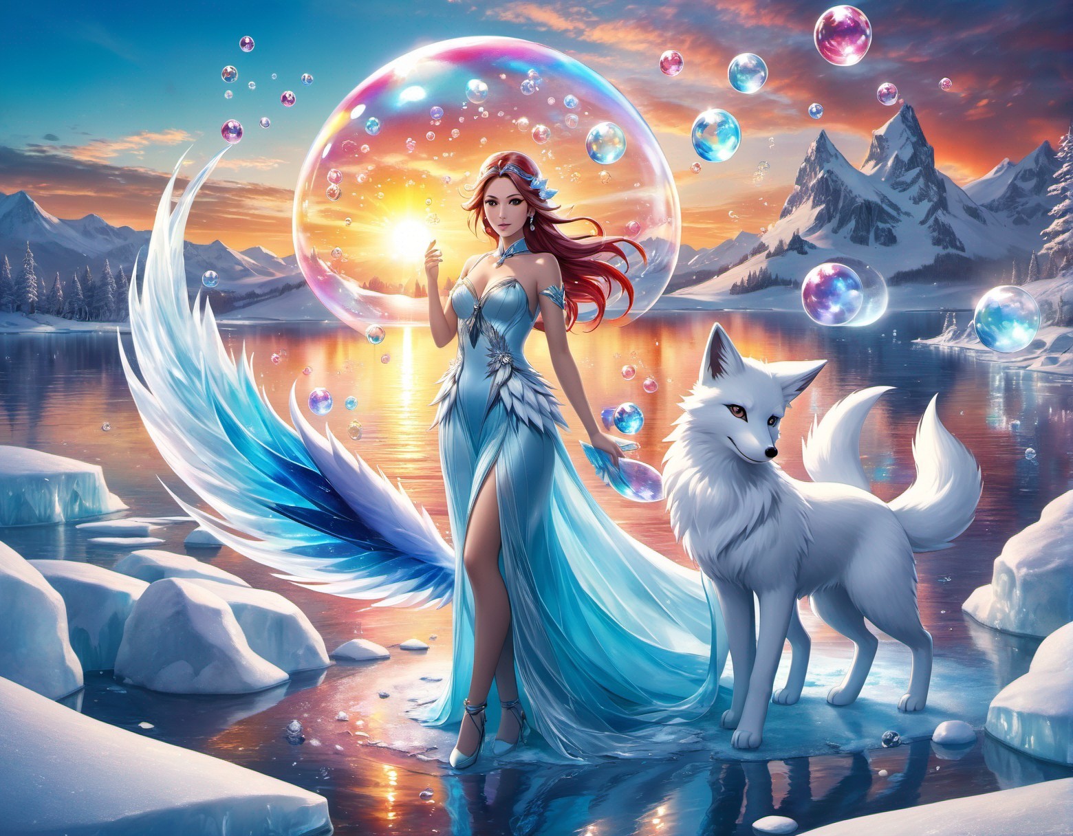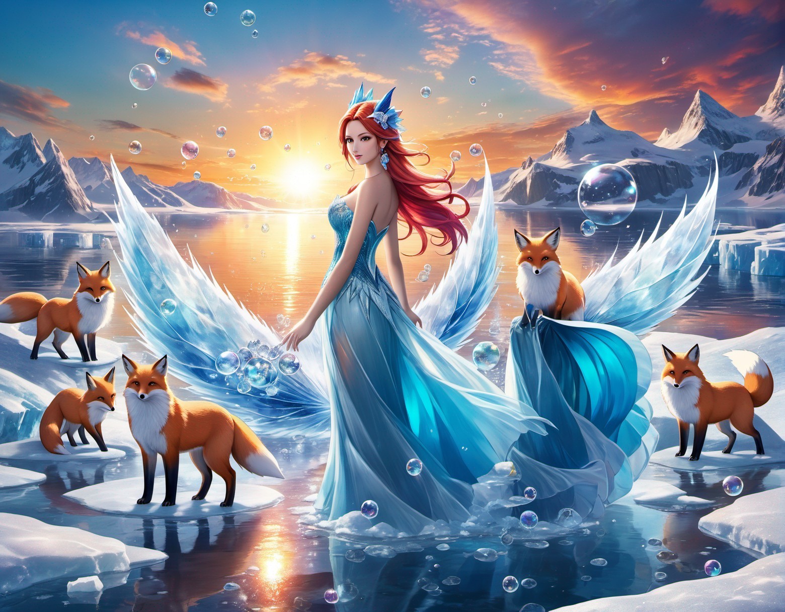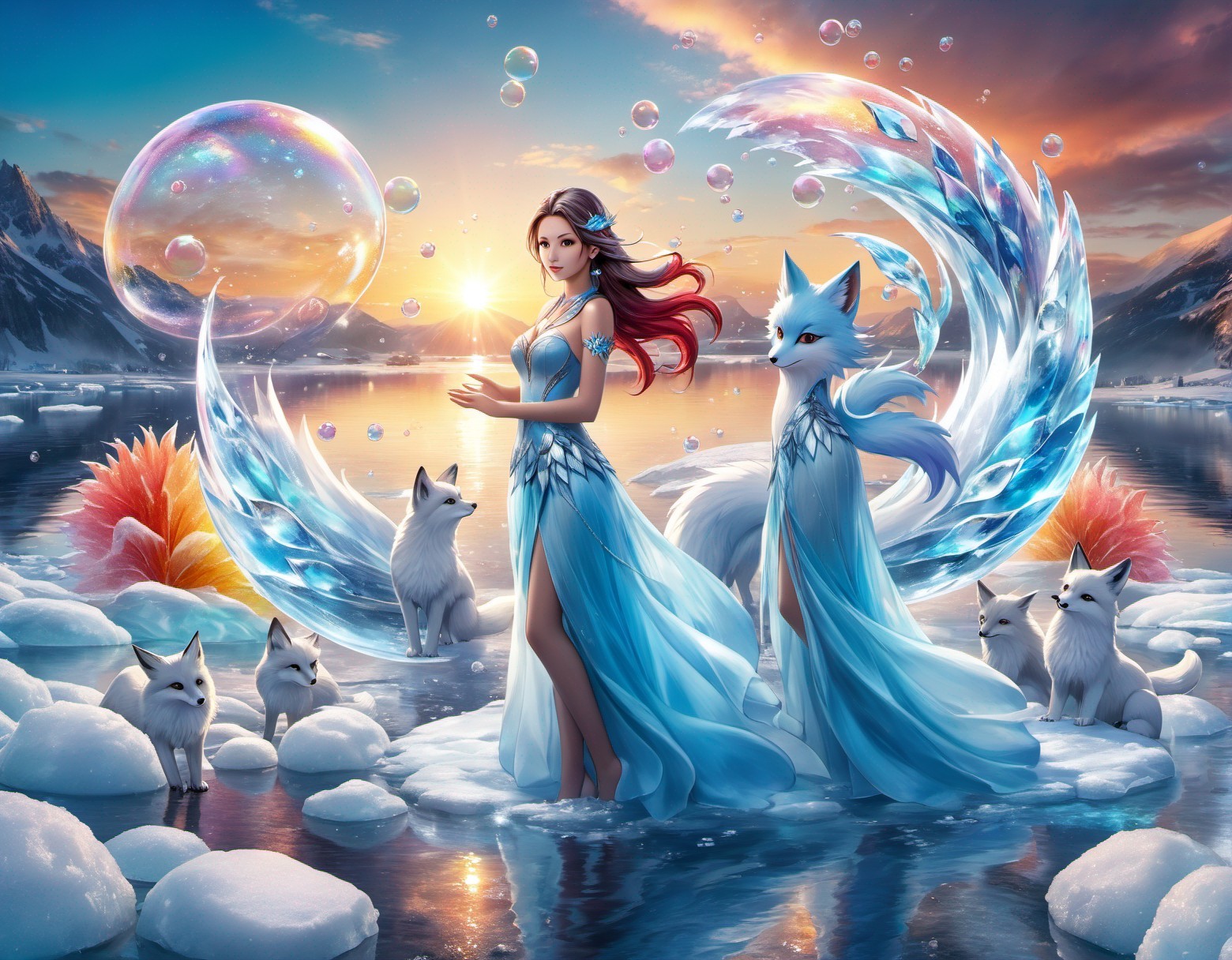 A fantasy illustration of a woman with flowing hair and dress, accompanied by mythical foxes, surrounded by bubbles in a snowy, icy landscape with a vivid sunset.