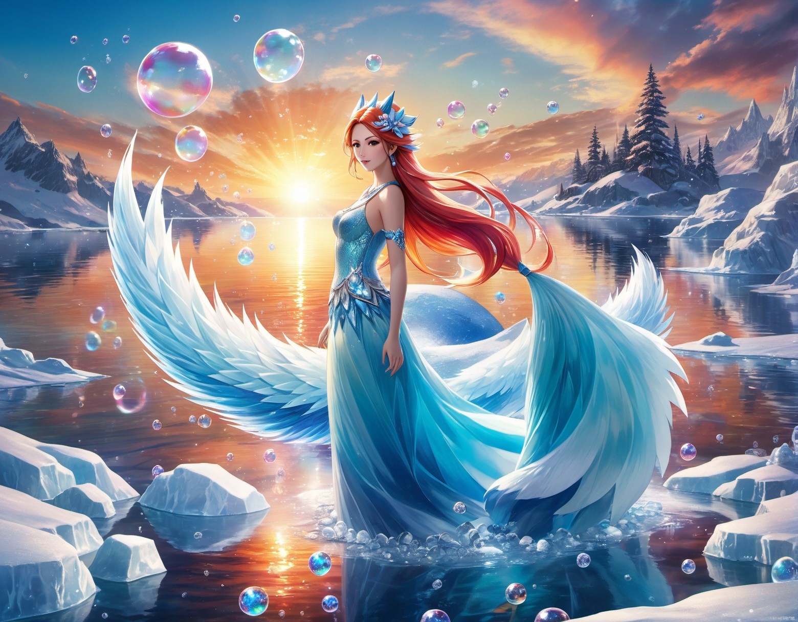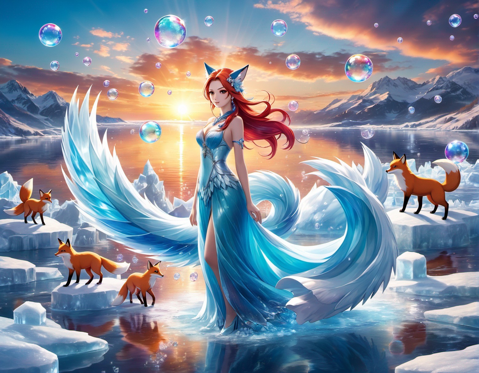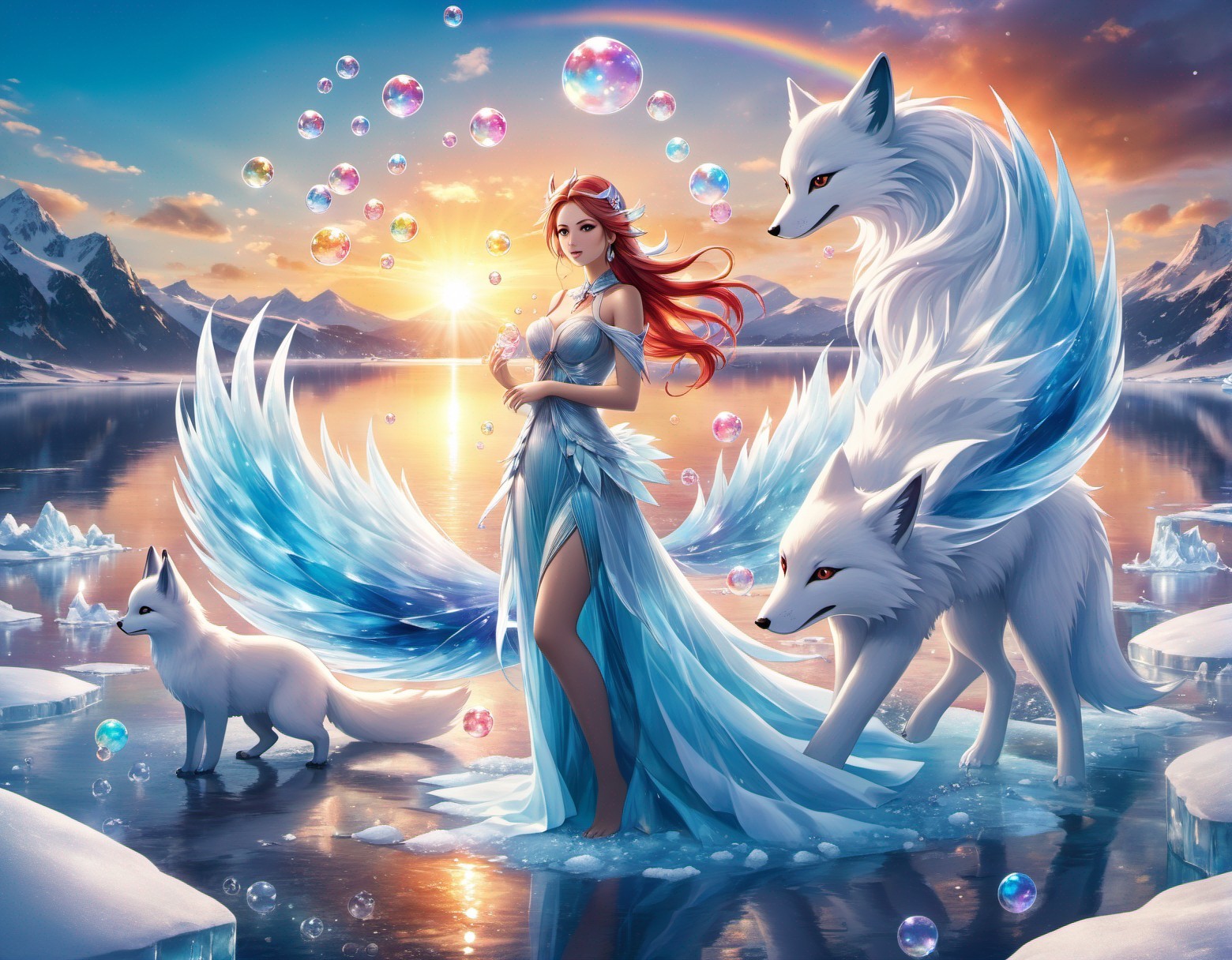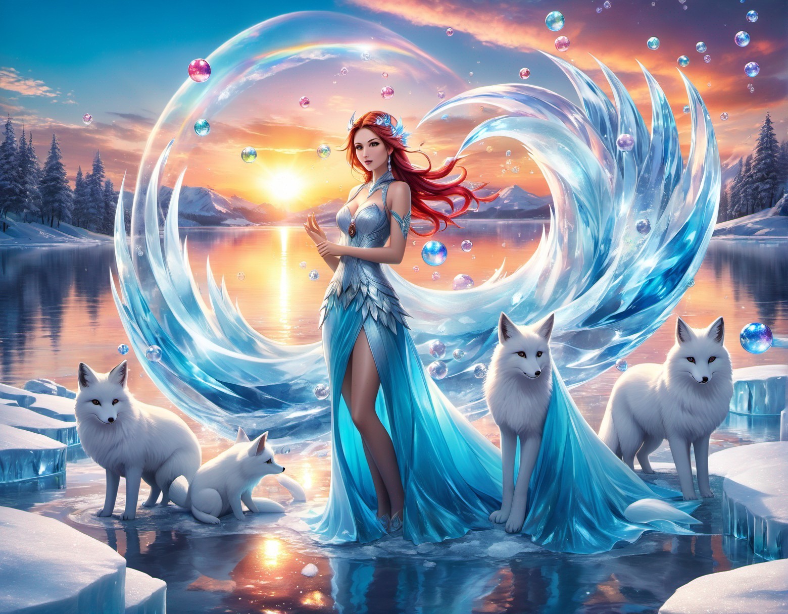 A fantasy illustration of a woman with flowing hair and dress, accompanied by mythical foxes, surrounded by bubbles in a snowy, icy landscape with a vivid sunset.