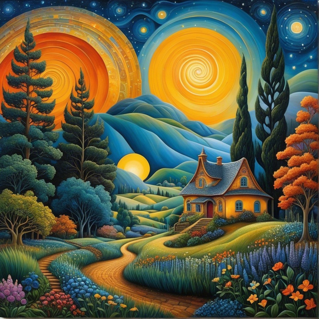 A vibrant landscape features a whimsical house surrounded by lush trees and colorful flowers. Two radiant suns illuminate rolling hills under a starry sky, creating a dreamlike atmosphere.