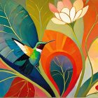Vibrant Hummingbird Amidst Colorful Abstract Leaves