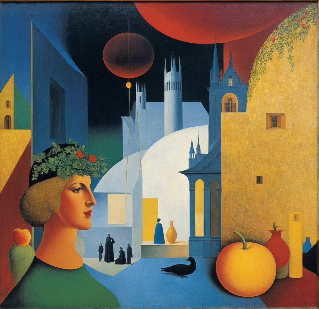 A woman with a leafy headdress gazes towards a surreal landscape featuring towers and a crescent moon. In the foreground, oranges sit beside elegantly dressed figures and a vibrant backdrop.