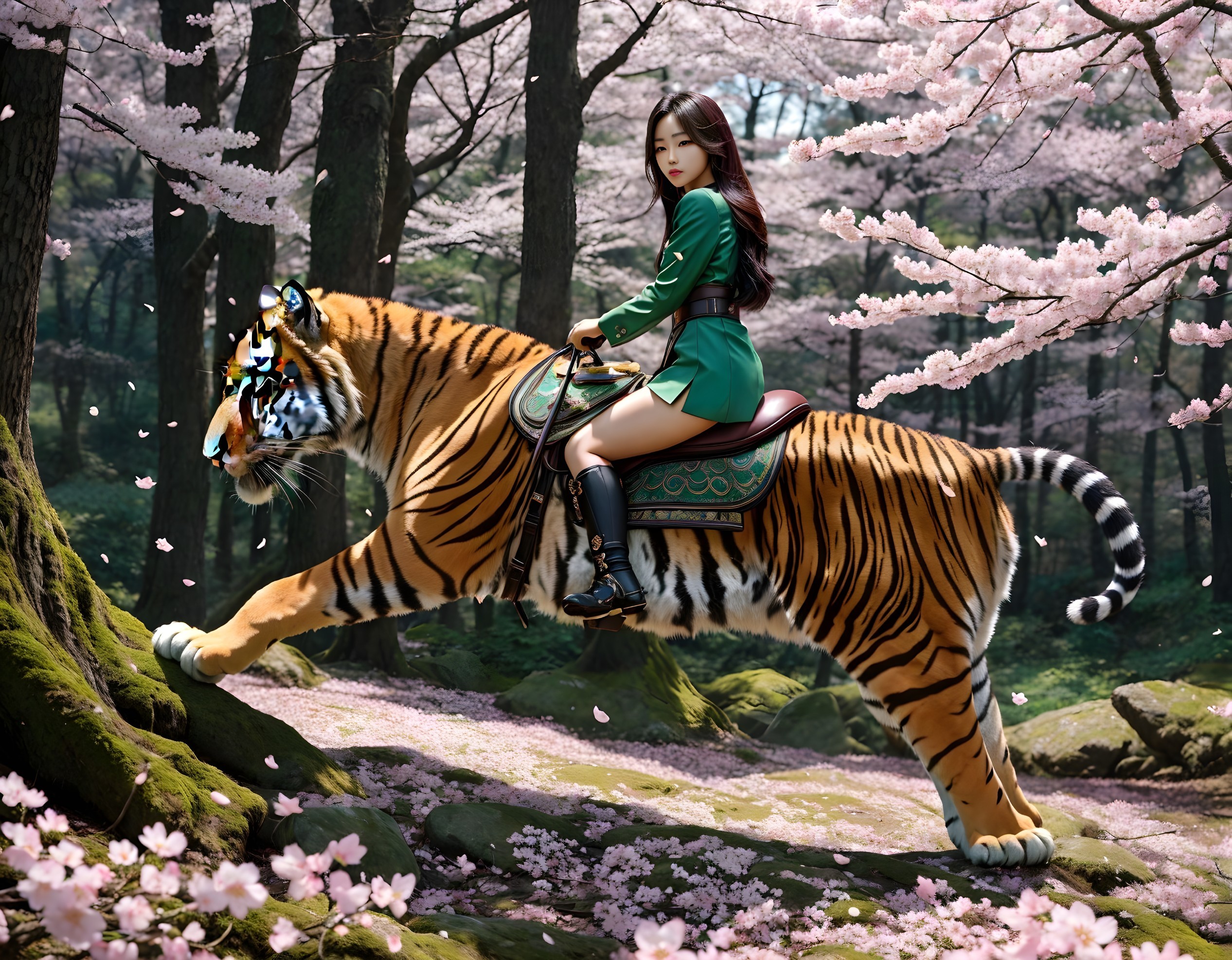 A gorgeous Korean K-Pop star riding on top of a tiger.