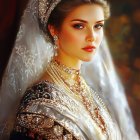 A portrait of a woman adorned in elegant traditional attire, featuring intricate jewelry, a delicate veil, and a stunning bejeweled headdress, exuding beauty and grace.