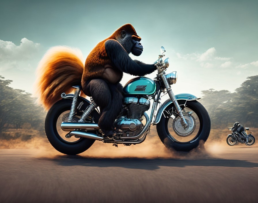 A gorilla rides a classic motorcycle on a dusty road, with another rider in the distance behind it.