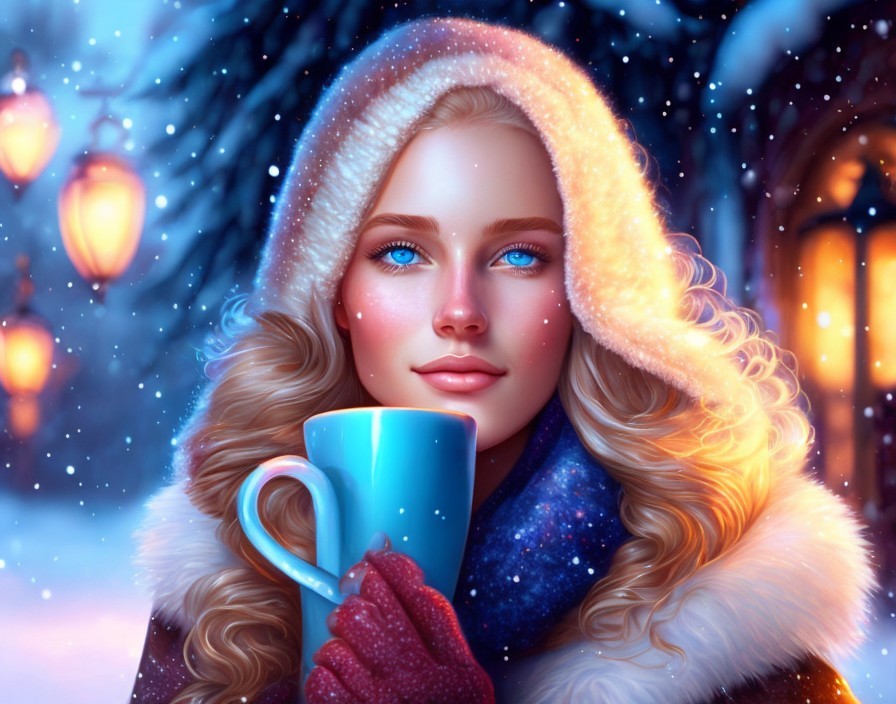 Blond woman with blue eyes in winter outfit holding a cup amidst falling snowflakes and glowing lantern