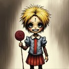 A spooky, stylized doll character with exaggerated features, including large black eyes and a wide, menacing smile adorned with sharp teeth. The doll has wild, spiky blonde hair and wears a blue jacket over a red dress with long, striped sleeves. It holds a large, swirling red lollipop in one hand. The background is a softly blurred gradient, enhancing the eerie atmosphere of the scene, creating a blend of playful and sinister elements.