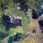 A serene woman sits amidst lush greenery and blooming flowers, her delicate features framed by soft pastels. The ethereal scene evokes a sense of tranquility and natural beauty.