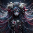 A whimsical character with vibrant pink hair and decorative horns emerges from a serene pool. She wears a sparkling outfit, adorned with flowers and surrounded by colorful orbs, evoking fantasy.