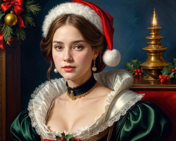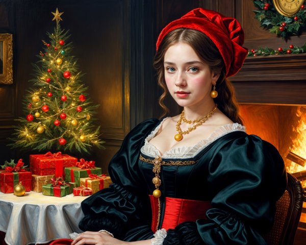 A portrait of a young woman in an elegant dark gown, featuring intricate details and a dramatic neckline. She gazes thoughtfully at the viewer, with a picturesque background of a city skyline.