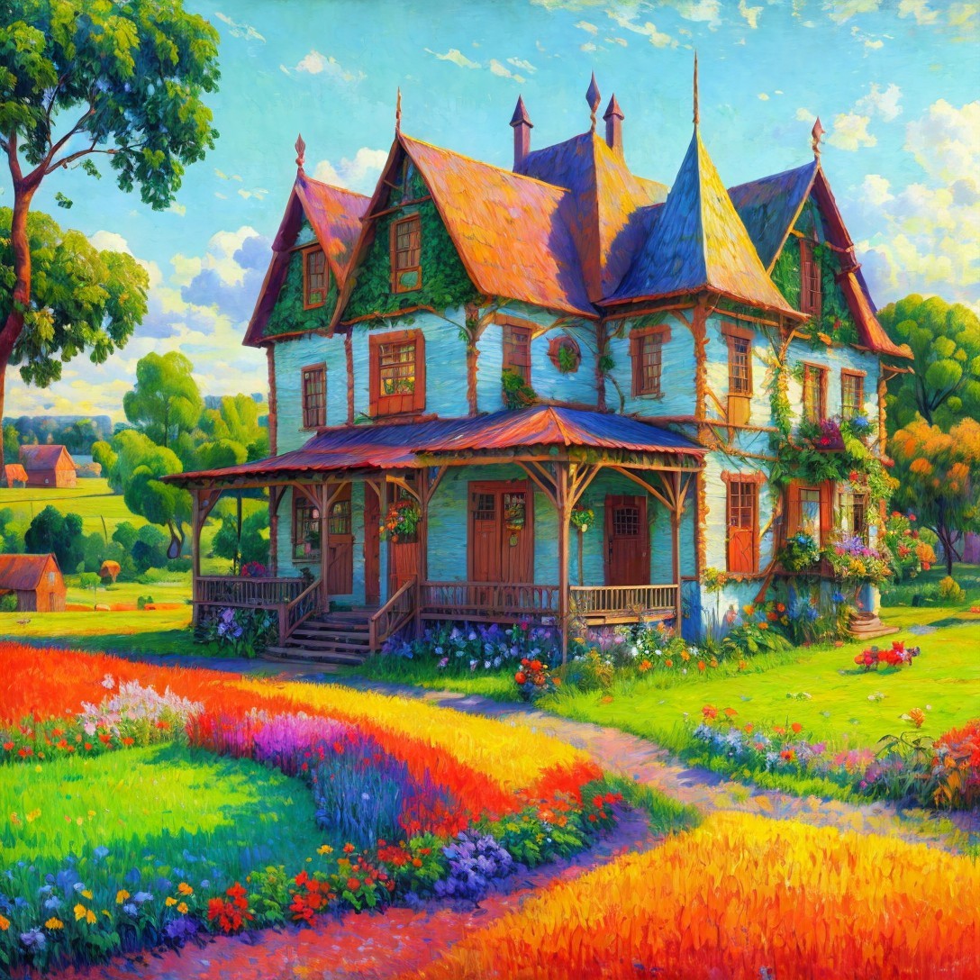 A vibrant painting of a quaint two-story house surrounded by lush gardens and a colorful flower path under a sunny sky.