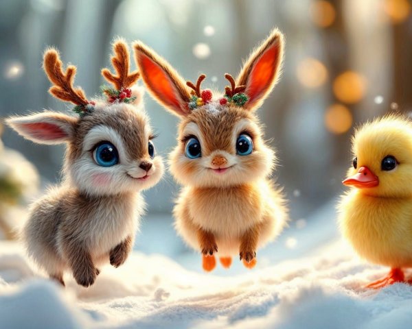A whimsical seaside village features colorful, flower-faced characters mingling among charming blue and white buildings, with a picturesque harbor and hills adorned with vibrant flowers in the background.