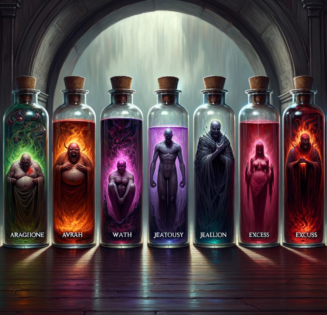 Seven bottles with colored liquids and trapped figures representing different vices labeled "Arrogione," "Avrah," "Wrath," "Jealousy," "Jeallion," "Excess," and "Excuss." All images are protected by copyright, author © ZhV, made by Artificial Intelligence (AI).