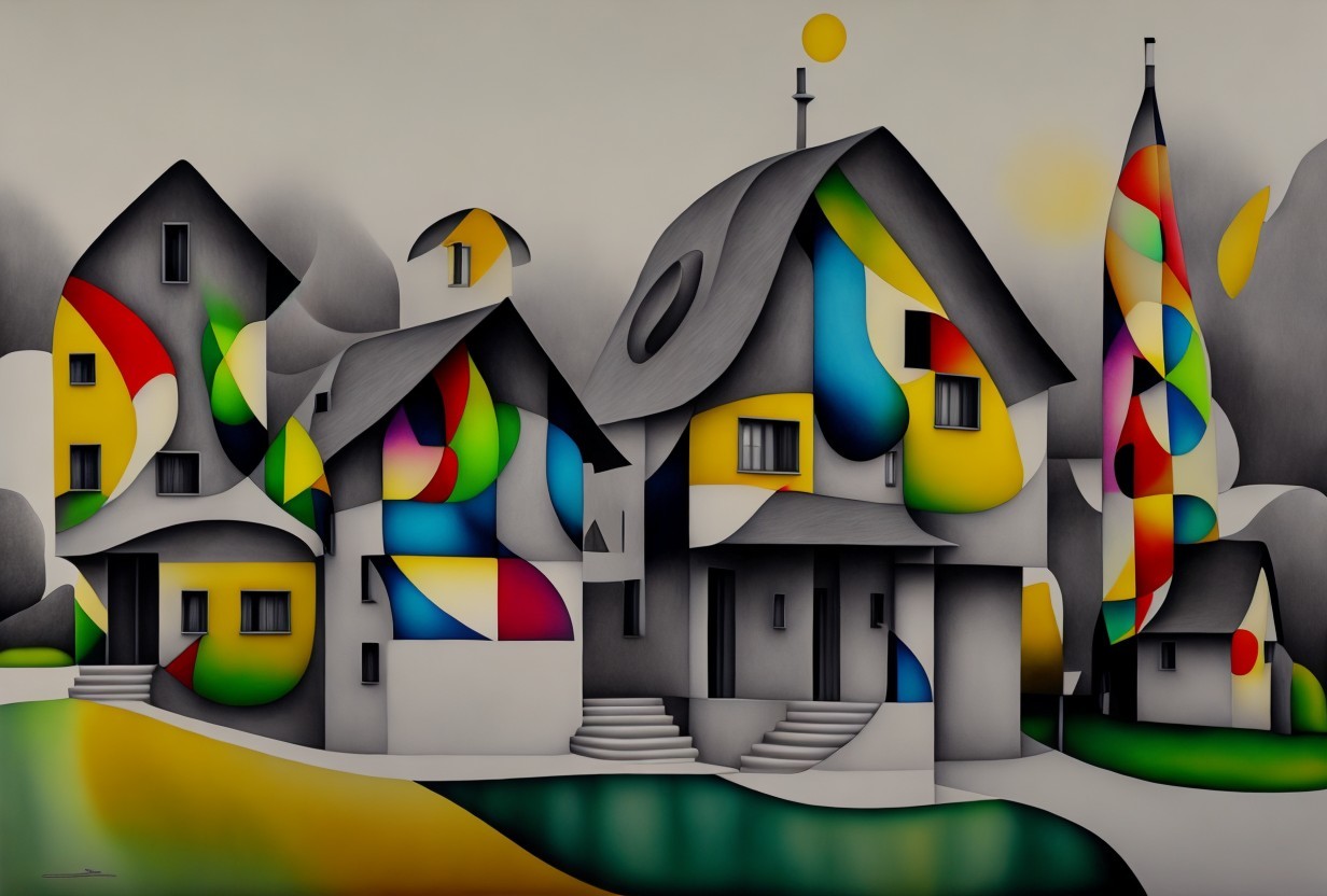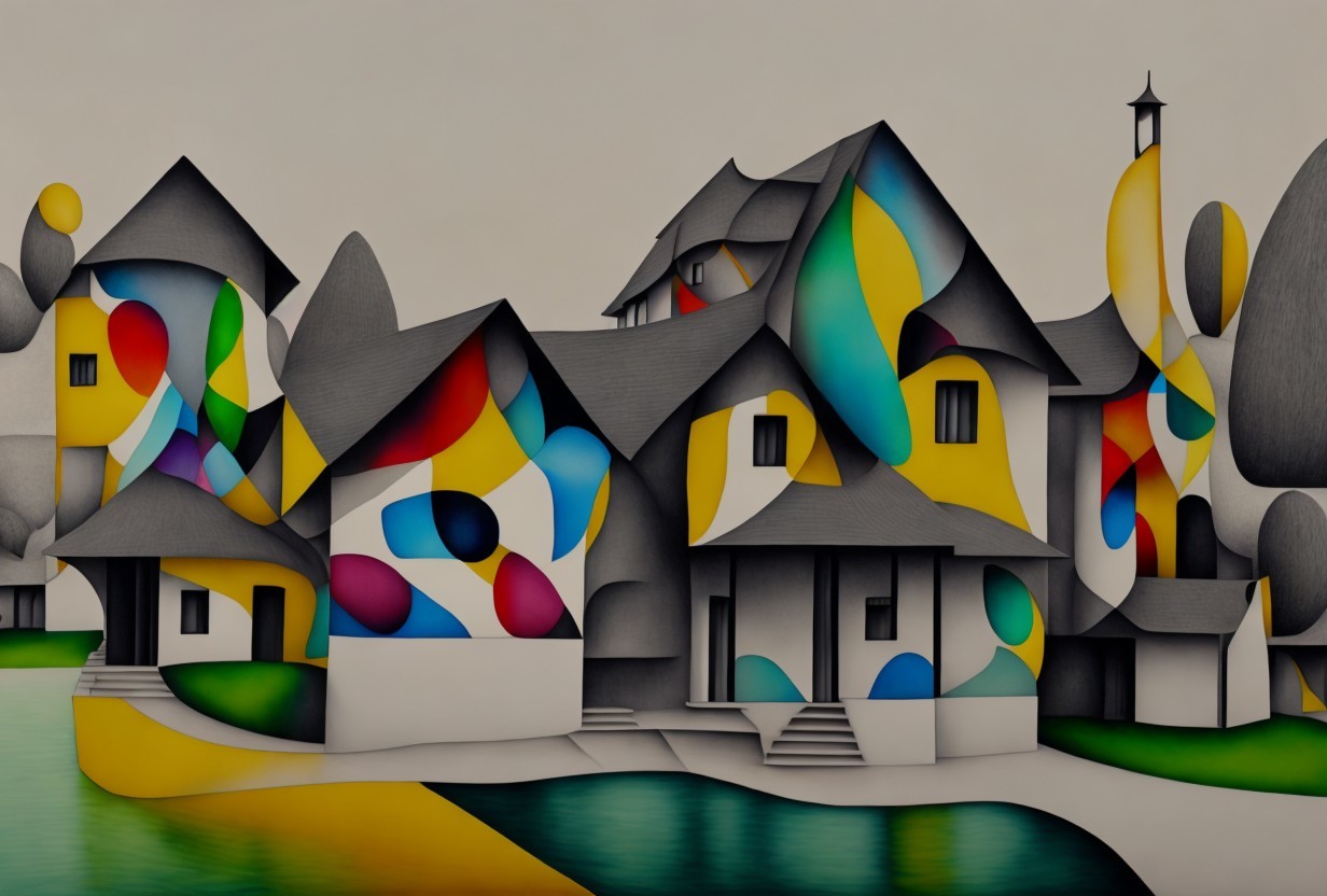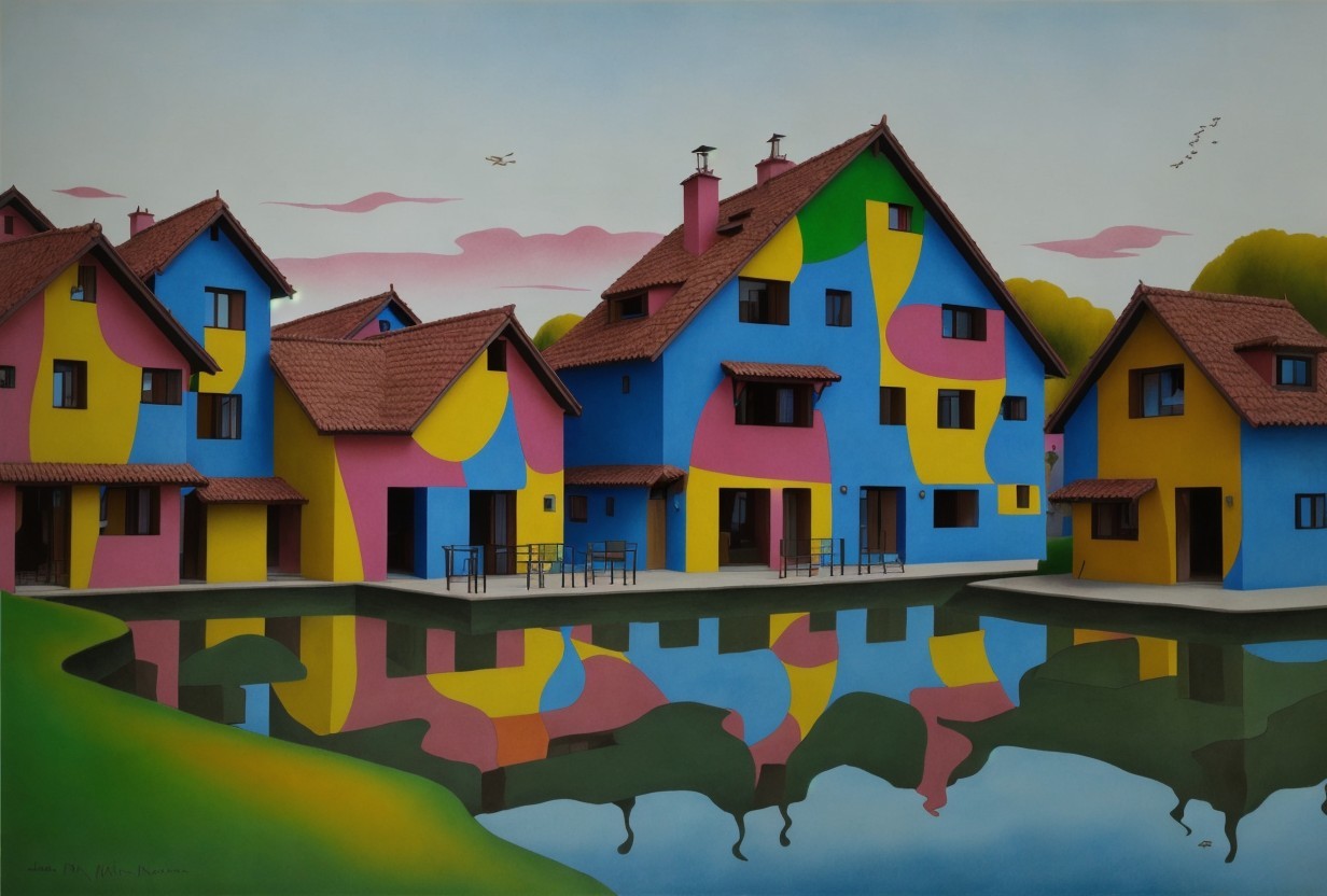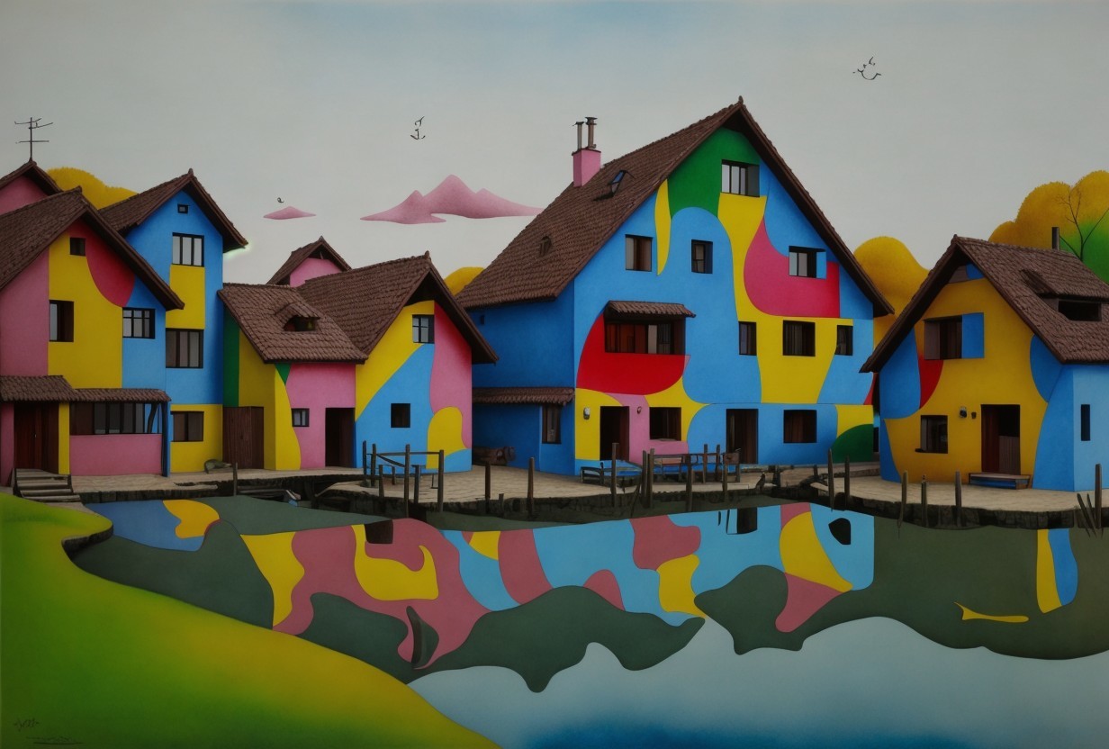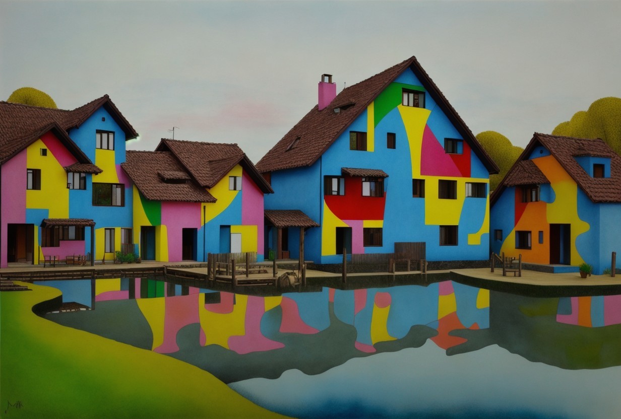 Colorful Stylized Houses Reflecting in Calm Waters Under Pastel Sky