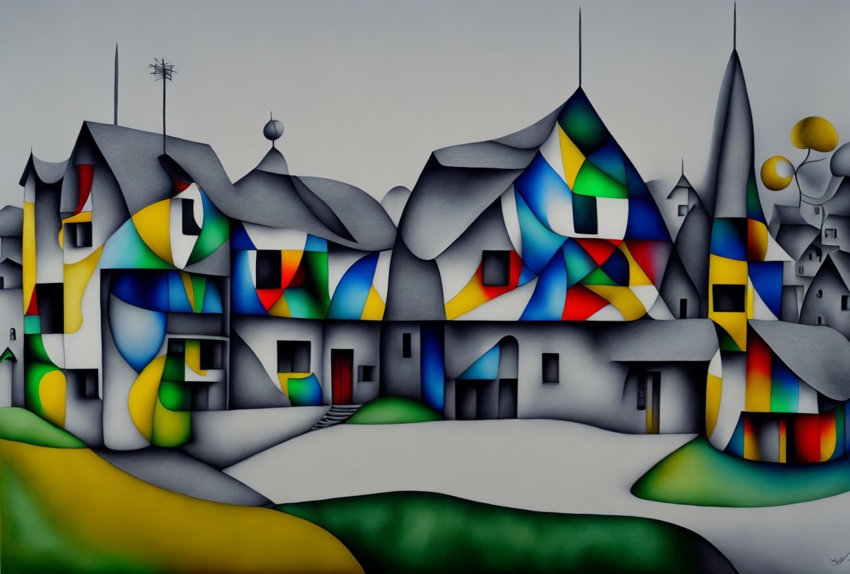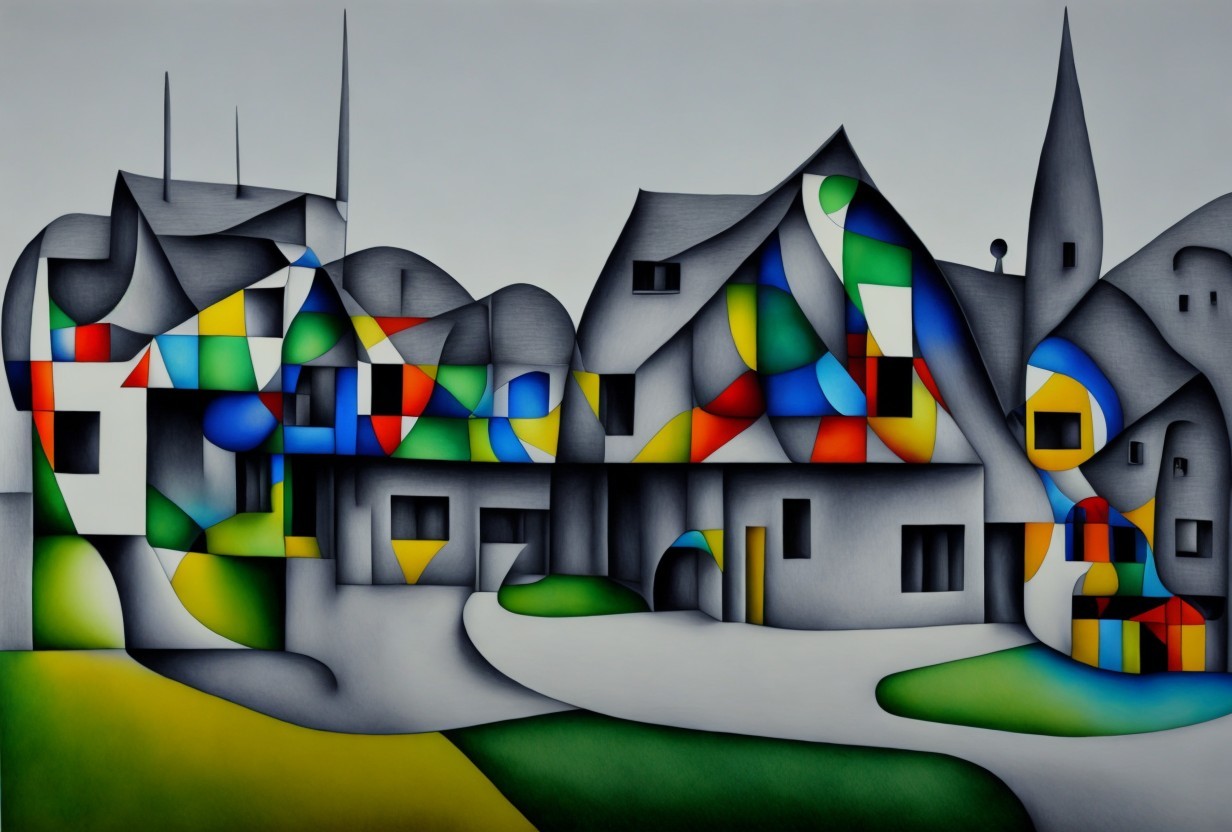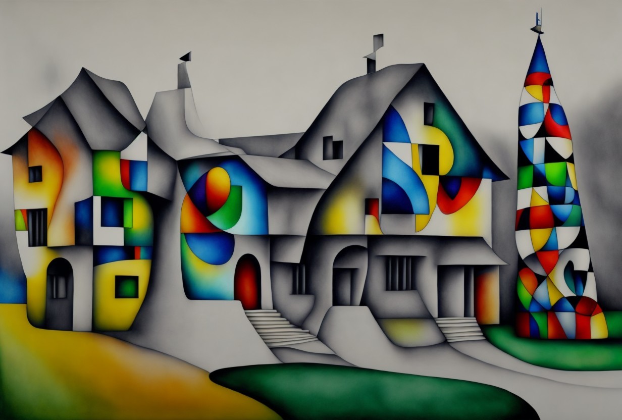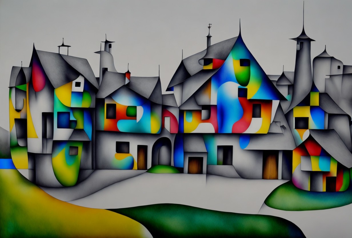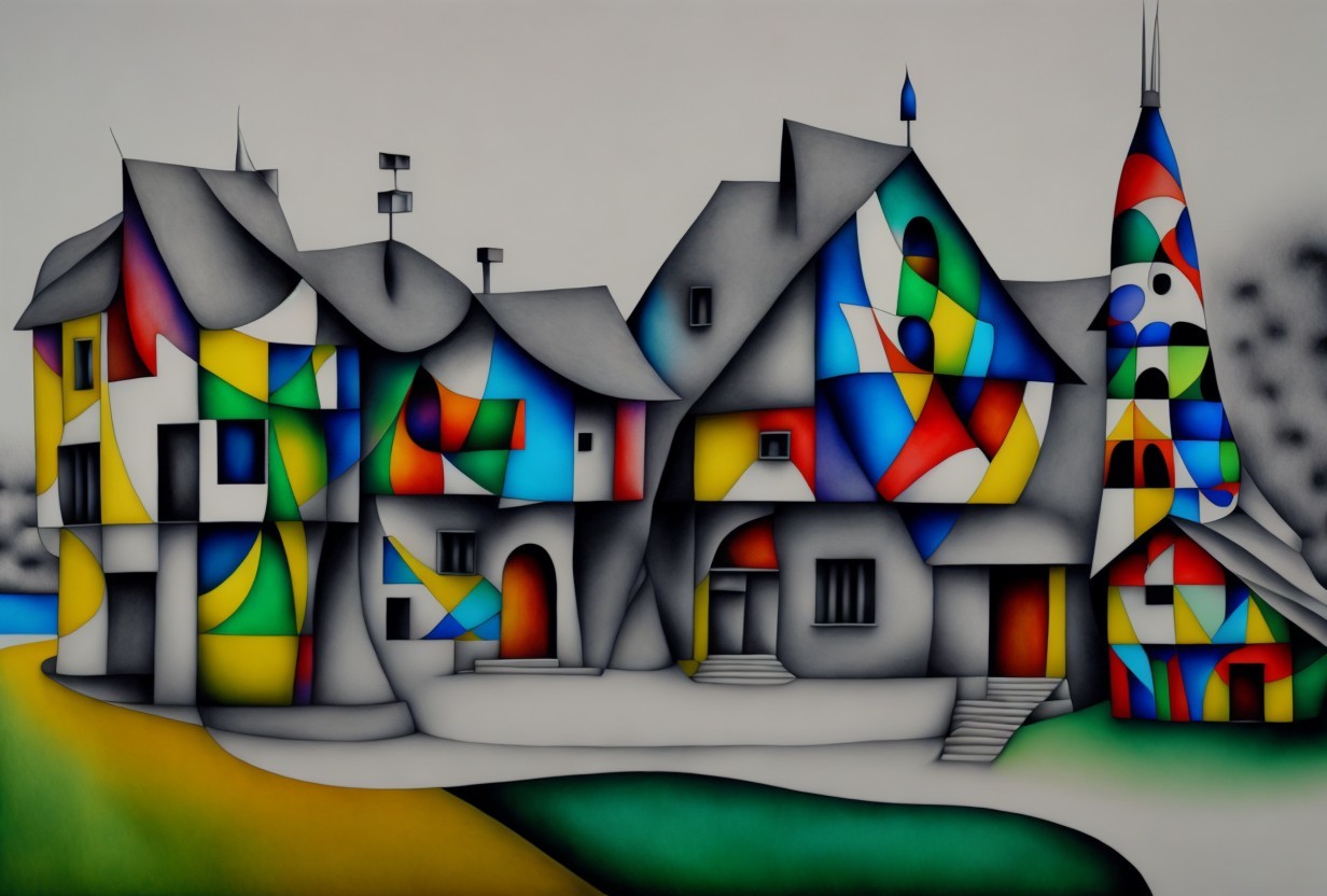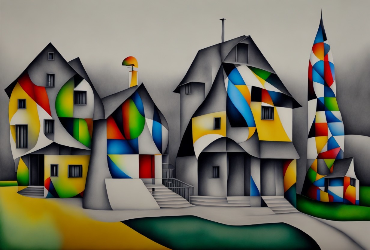 Colorful Stylized Houses Reflecting in Calm Waters Under Pastel Sky