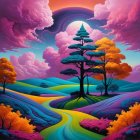 A vibrant landscape featuring rolling hills adorned with colorful flowers. Trees in bright hues stand against a surreal sky filled with swirling clouds and a radiant sun, creating a dreamlike atmosphere.
