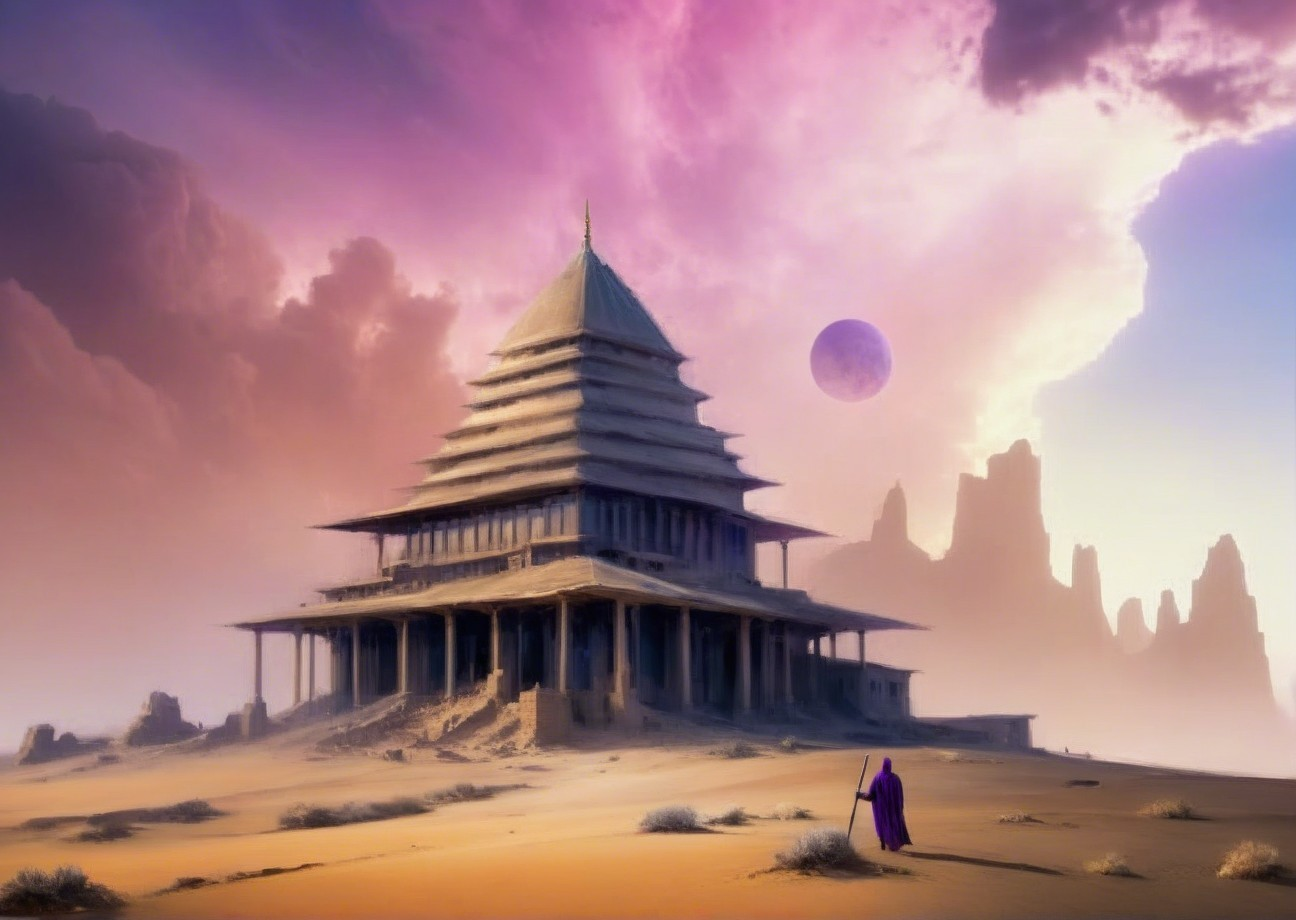 A majestic, multi-tiered temple rises in a sandy desert under a vibrant sky, with swirling clouds and a distant purple moon. A cloaked figure stands, gazing at the ethereal landscape.