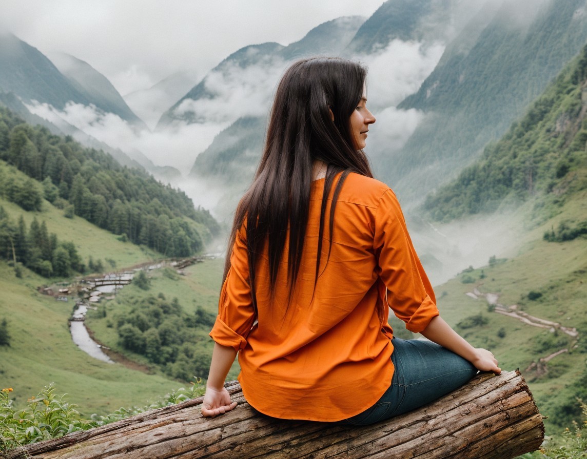 A woman sits on a log, gazing at a misty mountain landscape with snow-capped peaks and green valleys.