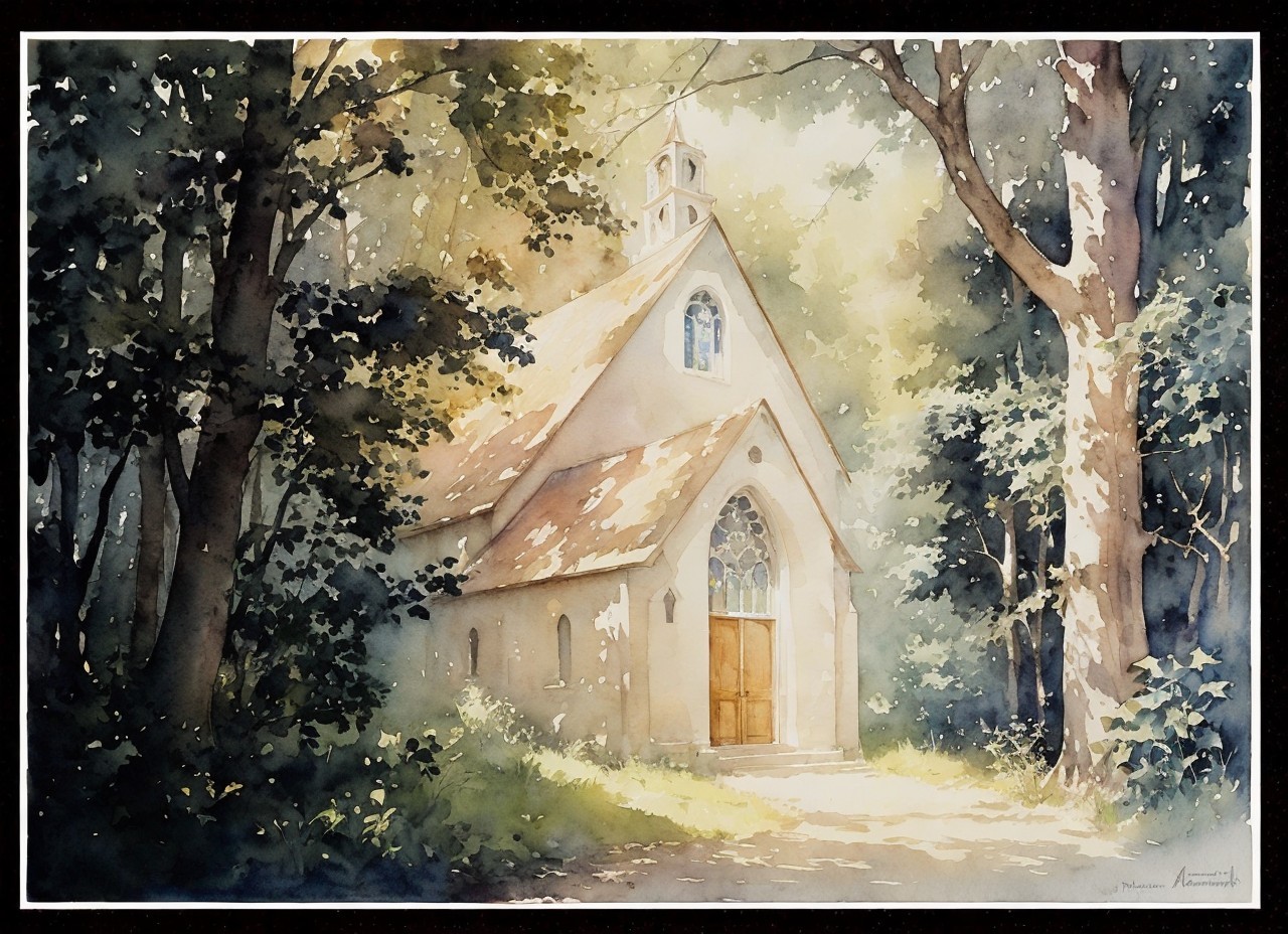 A serene watercolor painting of a quaint church nestled among lush trees, bathed in soft sunlight filtering through the foliage.