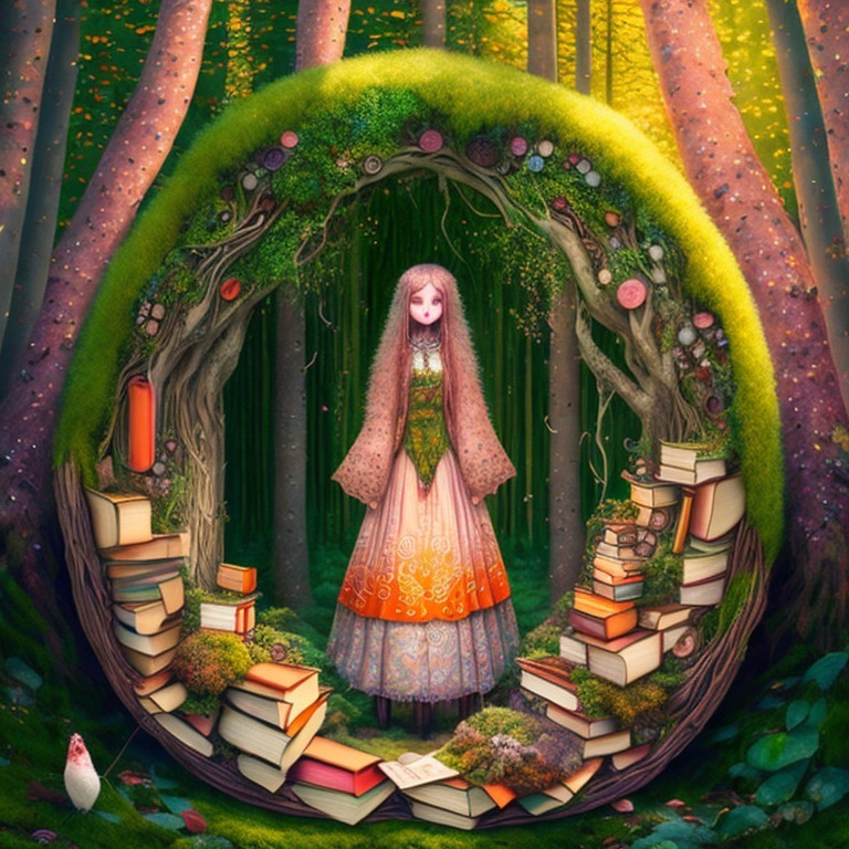 A girl stands inside a mossy, book-lined hollow in an enchanted forest; flowers and a small white bird accompany the serene scene.