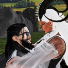 A striking couple poses in a dramatic landscape, with vibrant mountains in the background. The man, with braids and a beard, contrasts with the woman’s silver hair and ornate headpiece.