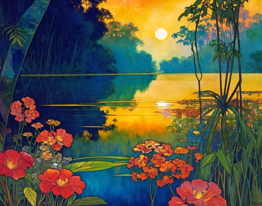 A vibrant, stylized painting of a lush garden with flowers against a backdrop of a sunset reflecting on water.