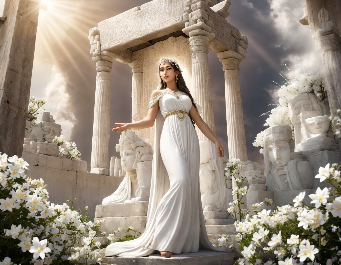 A woman in a flowing white gown and golden accessories stands amidst ancient ruins, surrounded by white flowers under a cloudy sky.