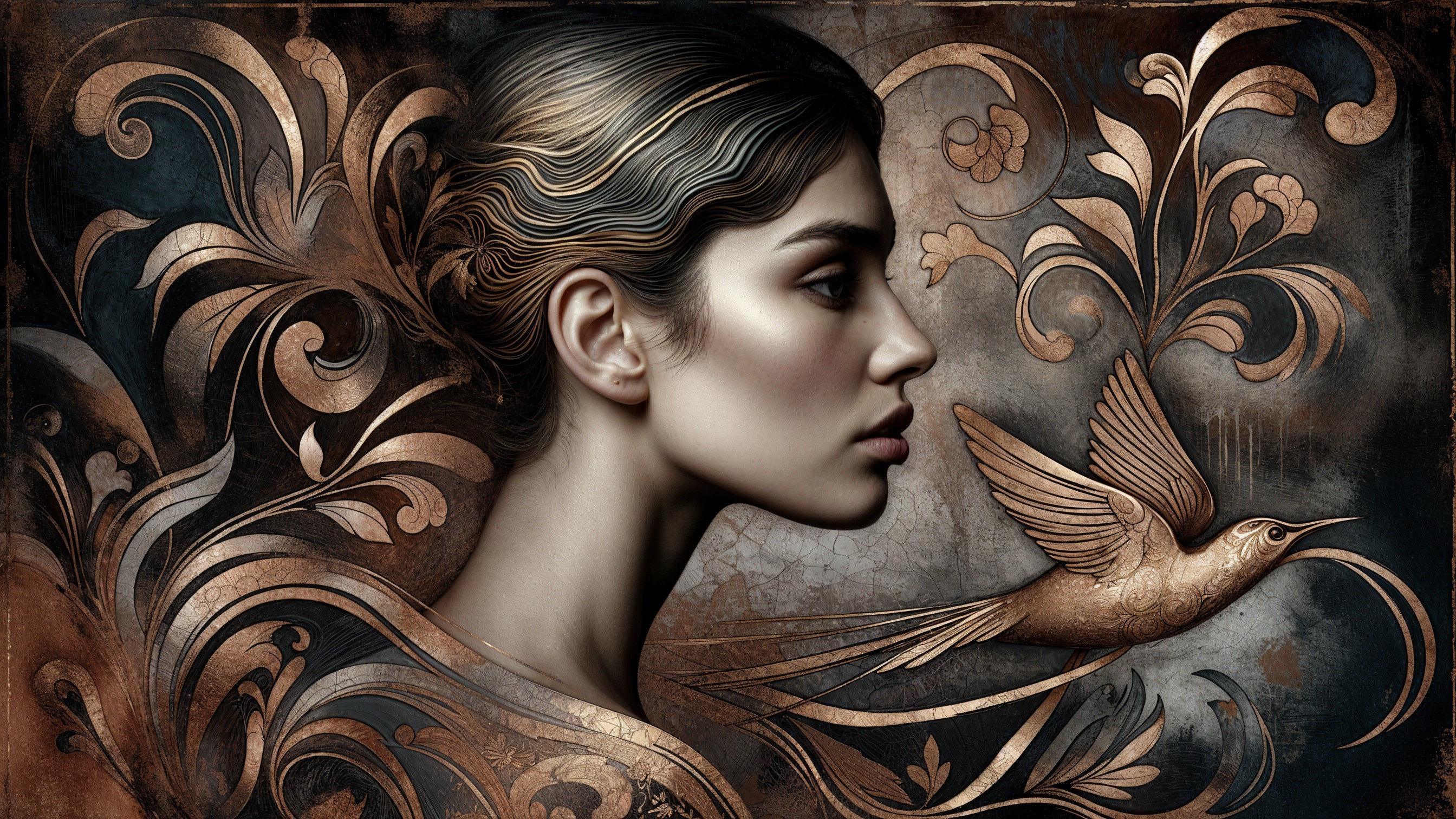 A woman with silver hair gazes thoughtfully beside a beautifully detailed sculpture of a flying dog, set against an ornate background, blending realism and artistry.