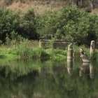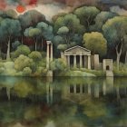A serene landscape featuring ancient ruins by a reflective lake. Lush greenery surrounds the scene, with a figure in a striking red dress standing nearby, enhancing the mystical atmosphere.