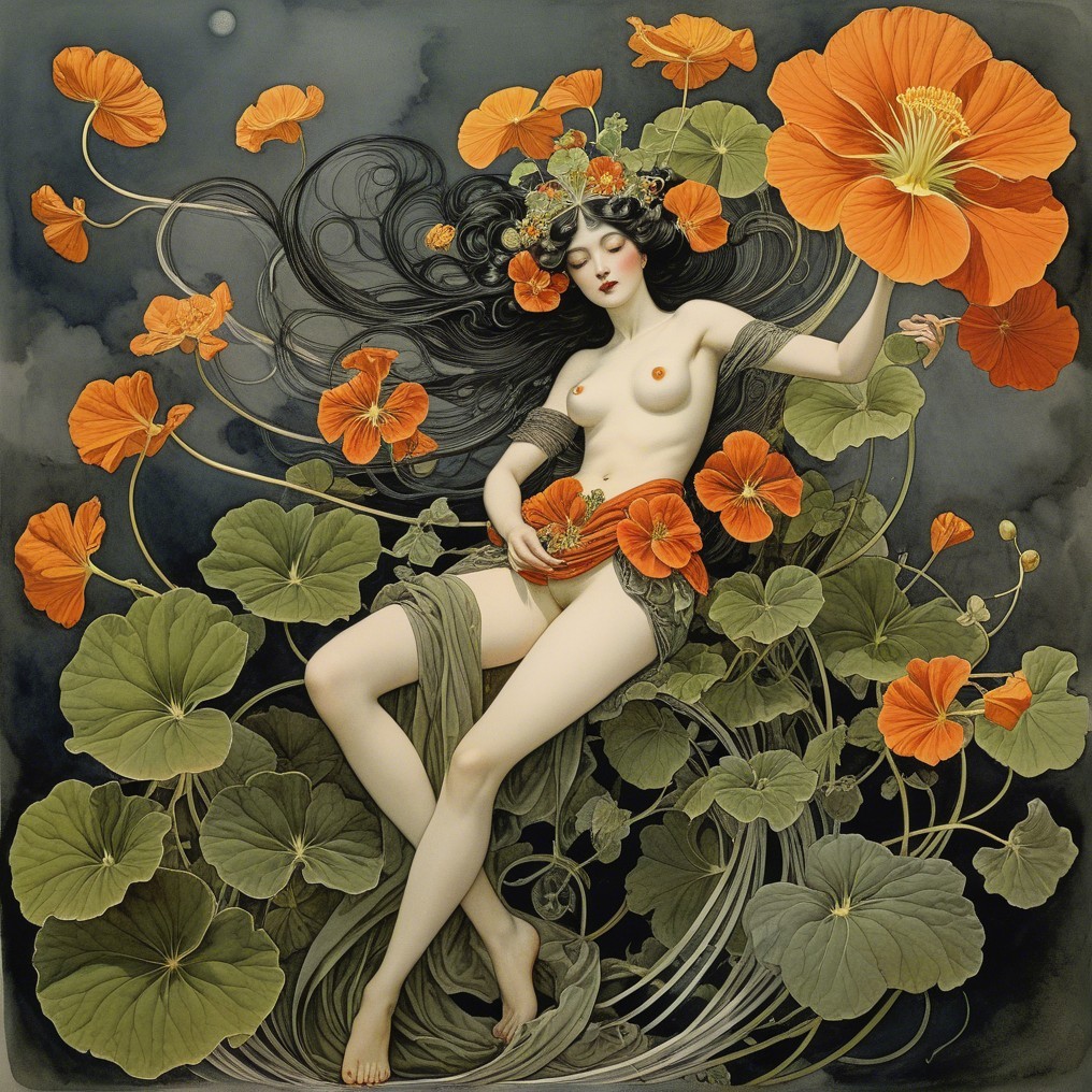 A serene woman in a flowing red dress sits surrounded by vibrant orange flowers and lush greenery, with a glowing moon above, creating a dreamy, ethereal atmosphere.