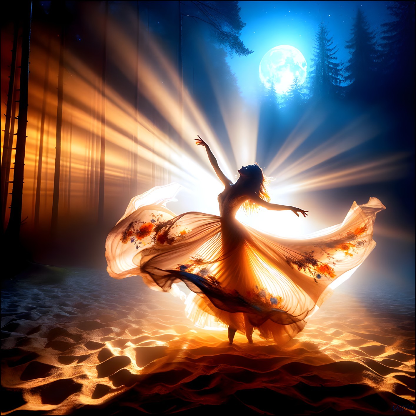 A mesmerizing description of a graceful dancer under the moonlight, surrounded by ethereal beauty and vivid imagery. The scene is vividly painted with intricate details and a dreamlike quality.