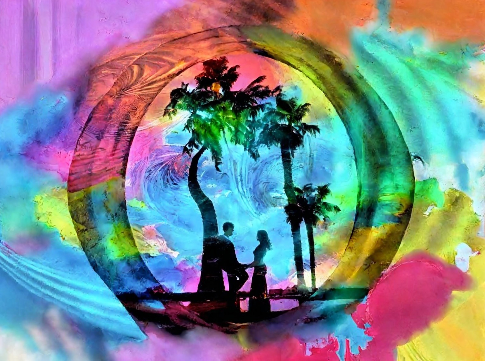 A vibrant, surreal scene features a couple silhouetted against a colorful background of tropical palm trees and abstract hues, creating a dreamy, romantic atmosphere.