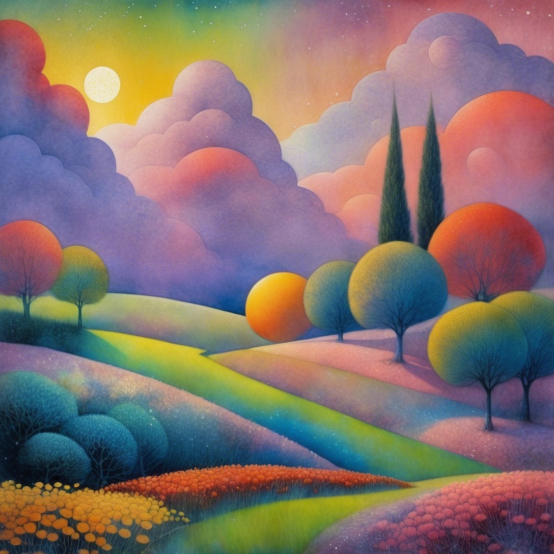 A vibrant, dreamlike landscape featuring rolling hills, colorful trees, and fluffy clouds under a glowing moonlight, creating a serene and enchanting atmosphere.