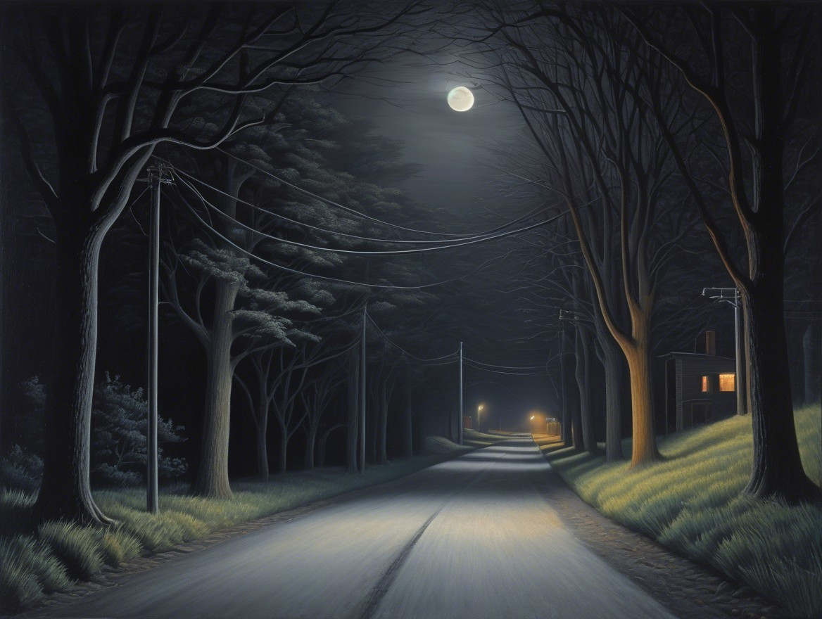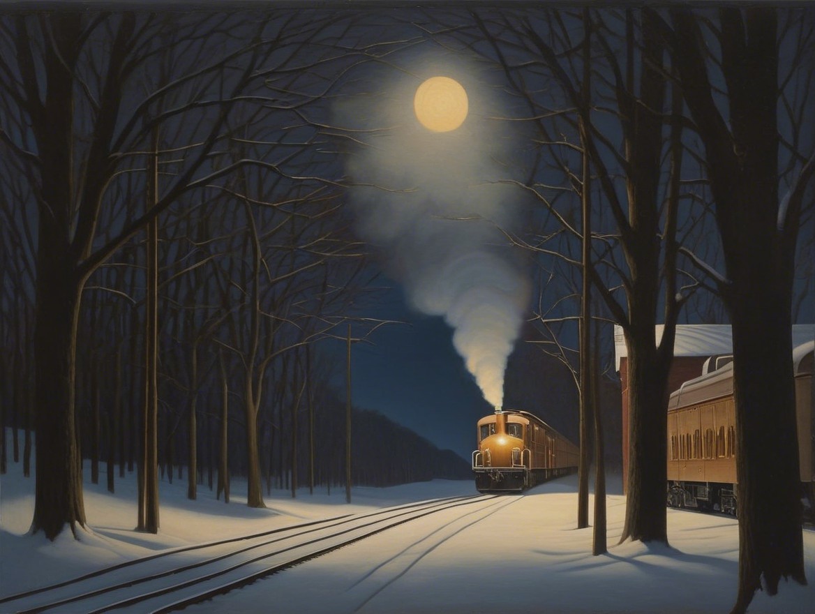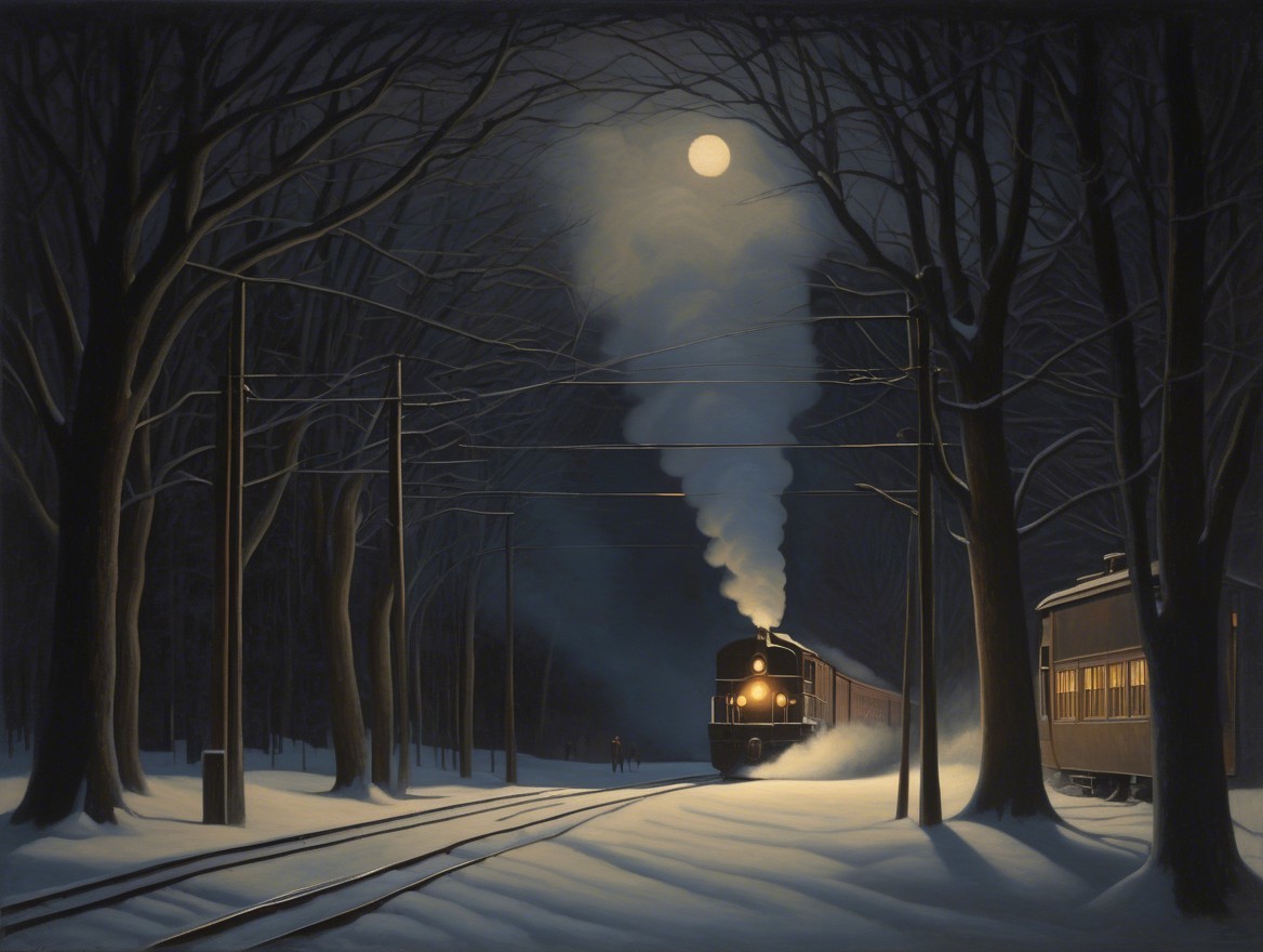 A train emits steam as it moves through a snowy landscape at night, illuminated by a bright moon. Tall trees line the tracks, casting long shadows in the serene winter scene.