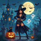 A stylish witch stands confidently in front of a full moon, with a spooky castle behind her. She's accompanied by two black cats and a carved pumpkin, all set in a Halloween atmosphere.